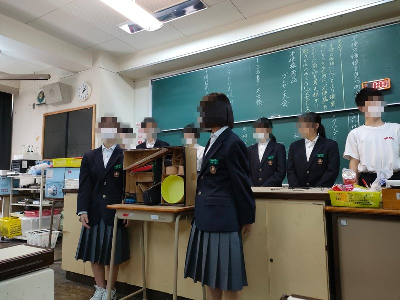 生徒たちには、考えたものを校内で発表し、先生方や先輩方に見てもらおうね、と話してプロジェクトをすすめていましたが、せっかく考えた不便益商品を、実際に商品開発をしている方々に見てもらい、評価していただくことで、生徒に達成感を味わわせることができるのではないか、と考えております。