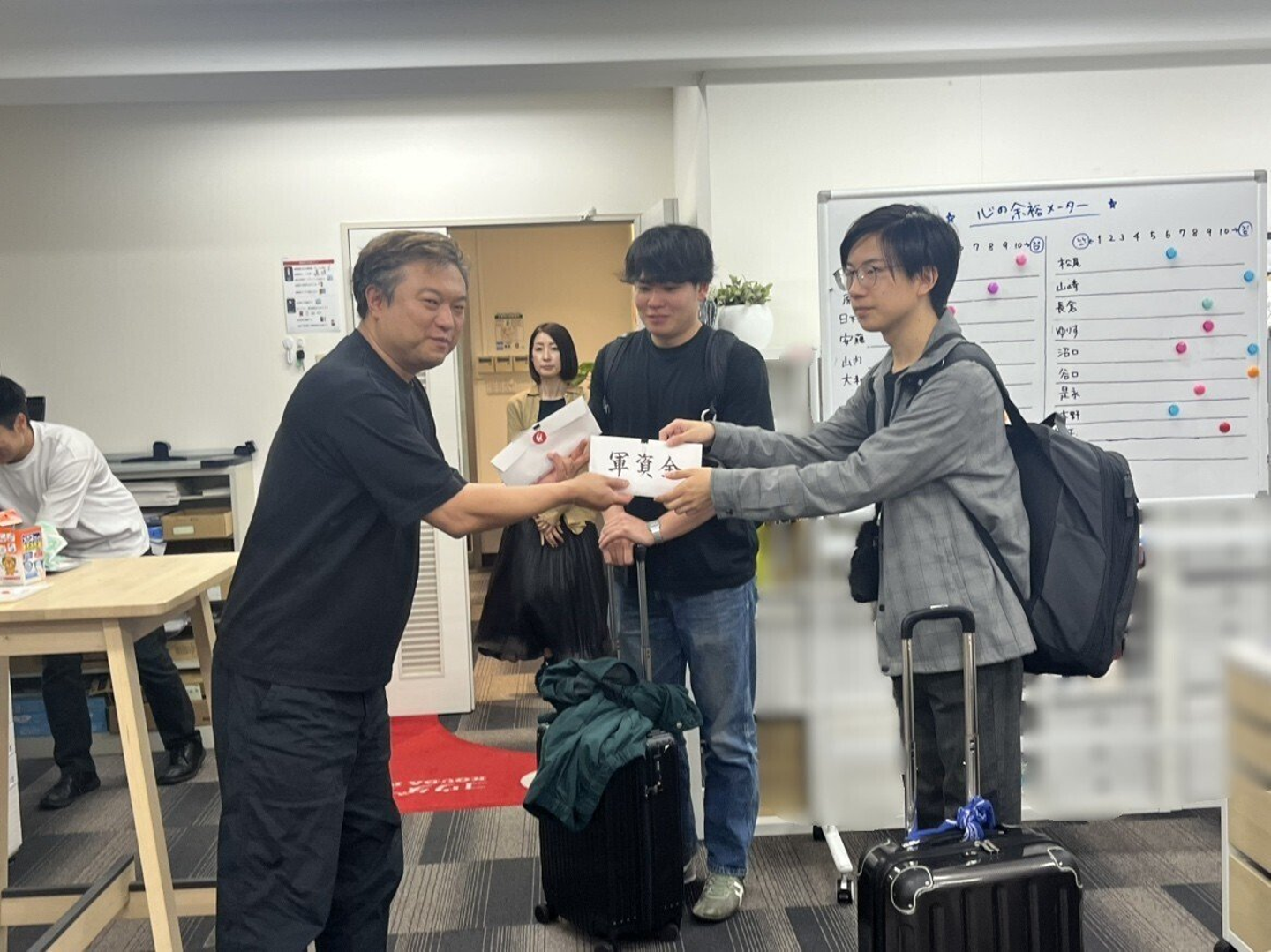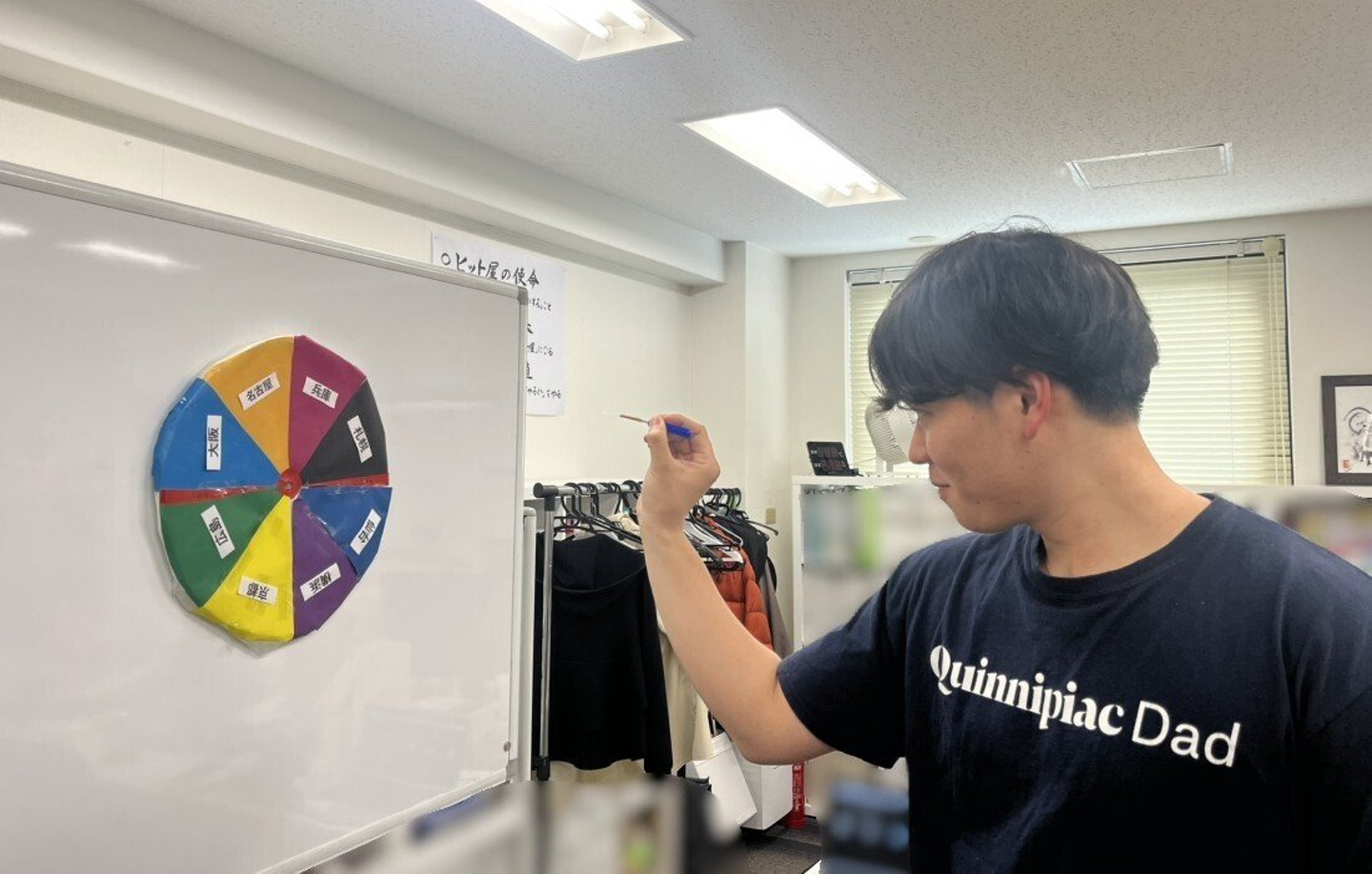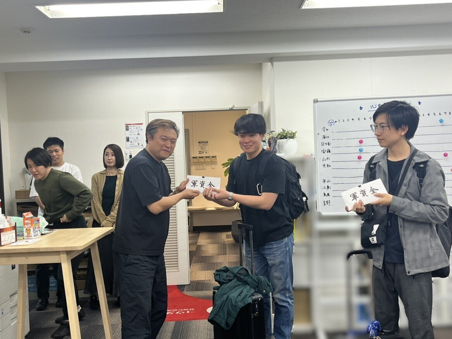 朝礼で、社長から「ダーツの旅に行きたいのか?」と問われた新卒の児玉くんと米山くん。