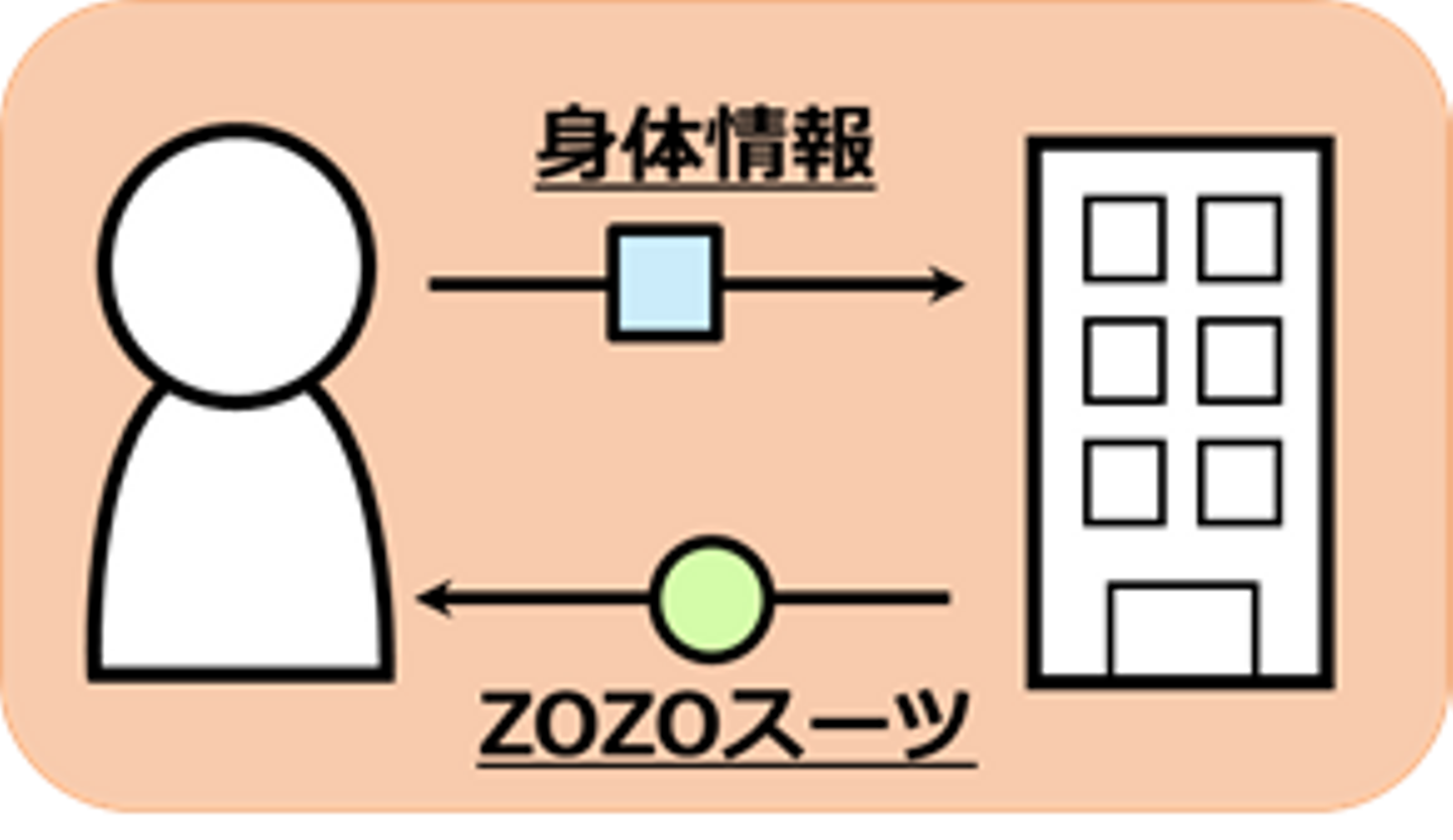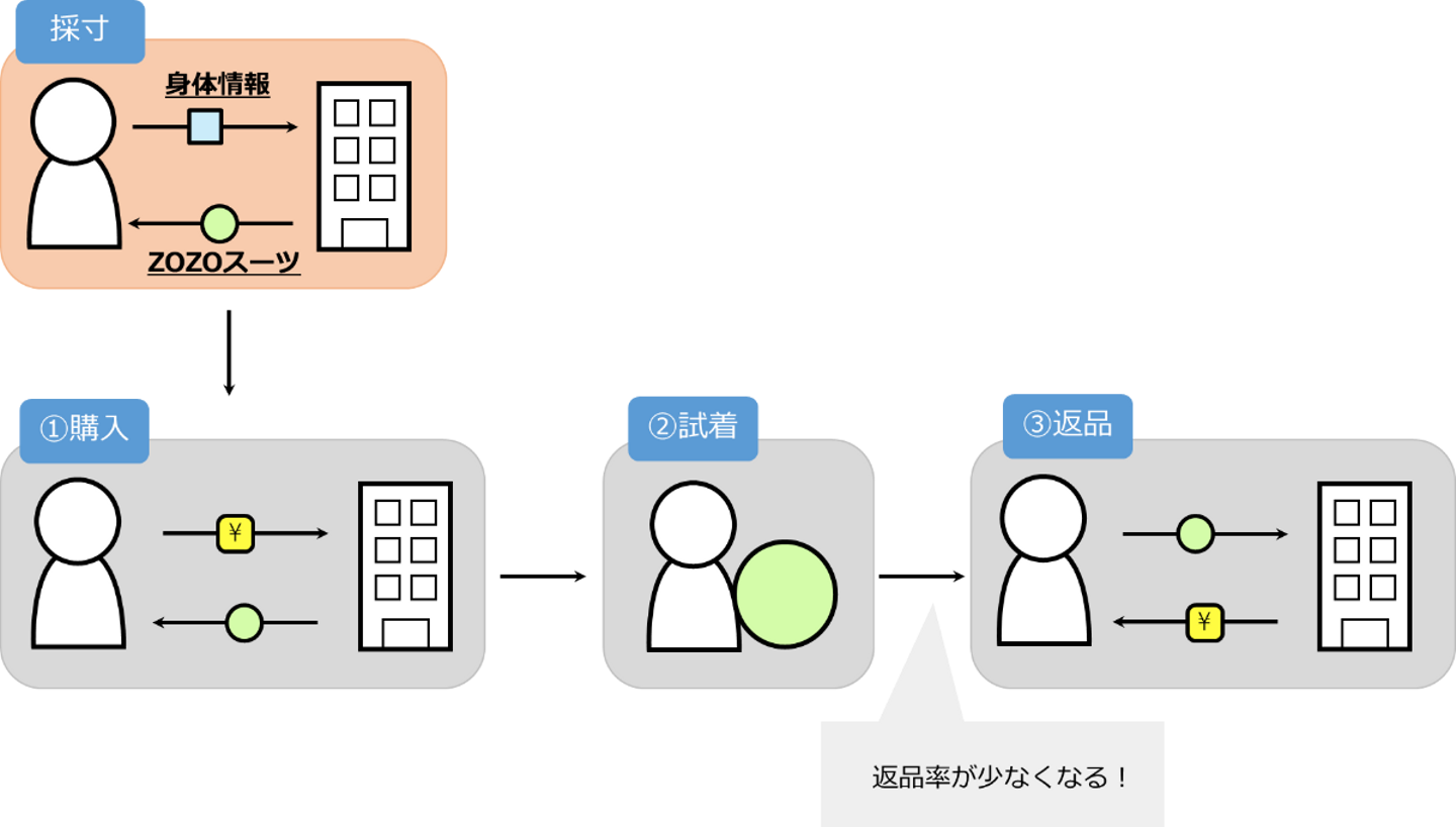 ZOZOスーツの狙いの一つが、サイズ不一致のリスクを軽減し、オンラインショッピングでの購入を促すという既存事業の拡大があります。実店舗であれば、試着をして自分に合ったサイズの服を購入することができますが、オンラインショッピングの場合は試着ができないため、自分の手元に届くまで自分のサイズに合うのか分かりません。しかし、ZOZO SUITで採寸すれば、購入後にサイズが合わないというリスクを軽減することができ、自分に合ったサイズの服を購入することができるのです。従来のオンラインショッピングはこのようなイメージです。