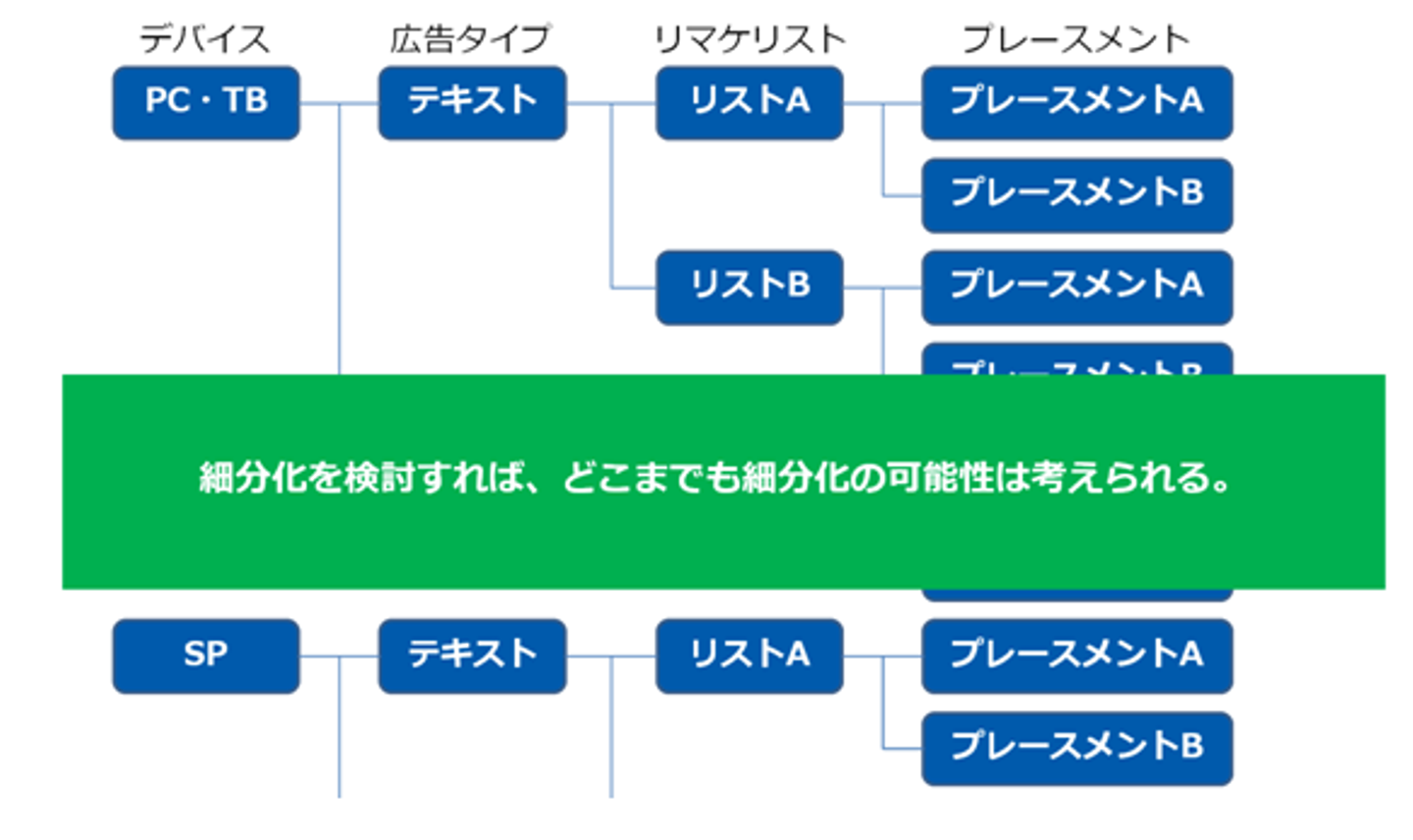 アカウントリストラクチャーとは、簡単に言及すると、広告の表示機会損失を最大限抑えるため、過剰に細分化されたアカウント構成を再構成することを指します。推奨によると、1コンテンツ(LP)=1広告グループが理想です。日本で良くやってしまいがちなアカウントの細分化は、下記のケースが多いのではないでしょうか。