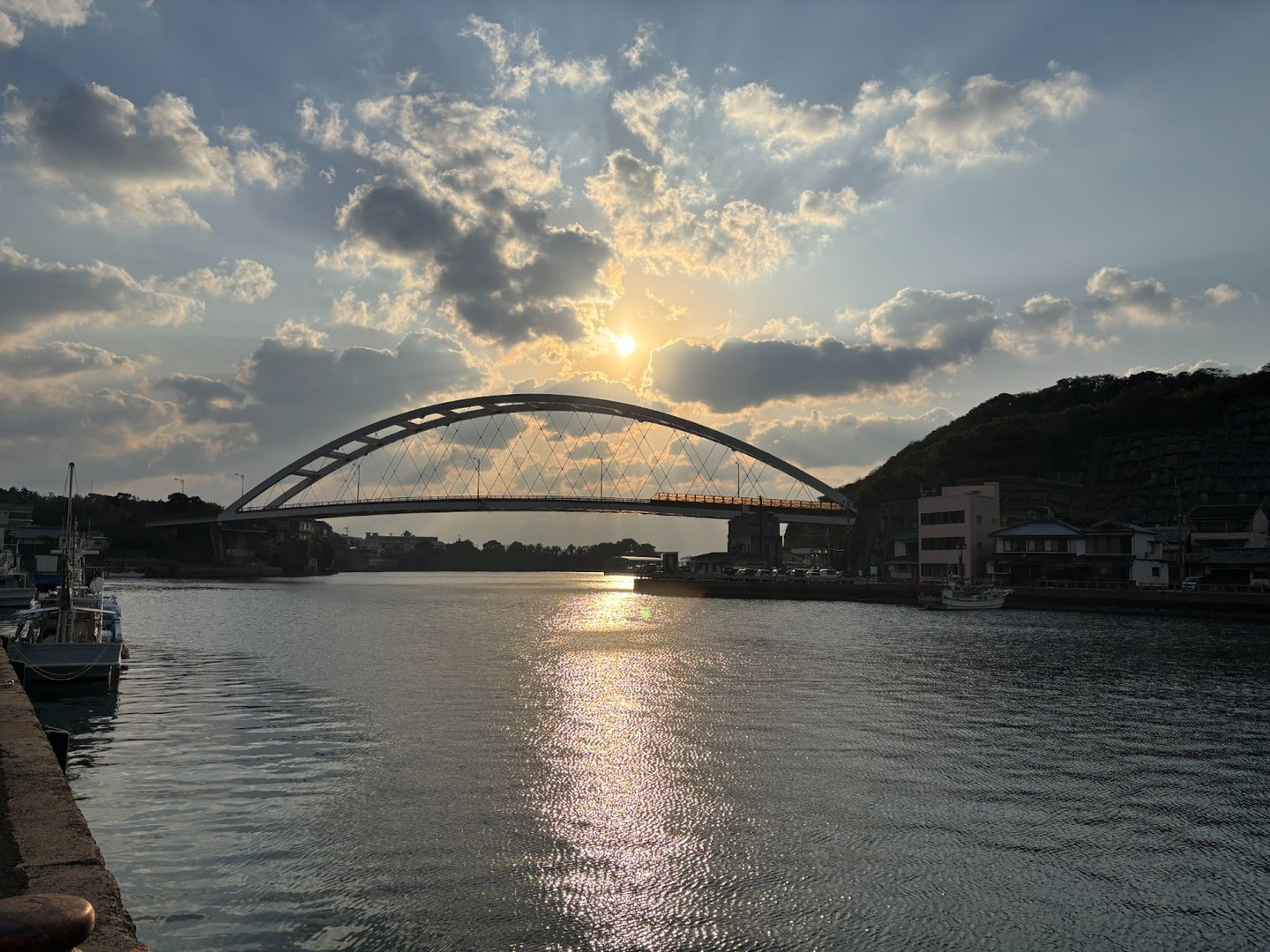 さらに歩くと、夕陽に照らされた郷ノ浦大橋が姿を見せました。郷ノ浦港にフェリーで入港した際にまず目に飛び込んでくるランドマークです。太陽の光が海に反射して、とても印象的な景色でした。