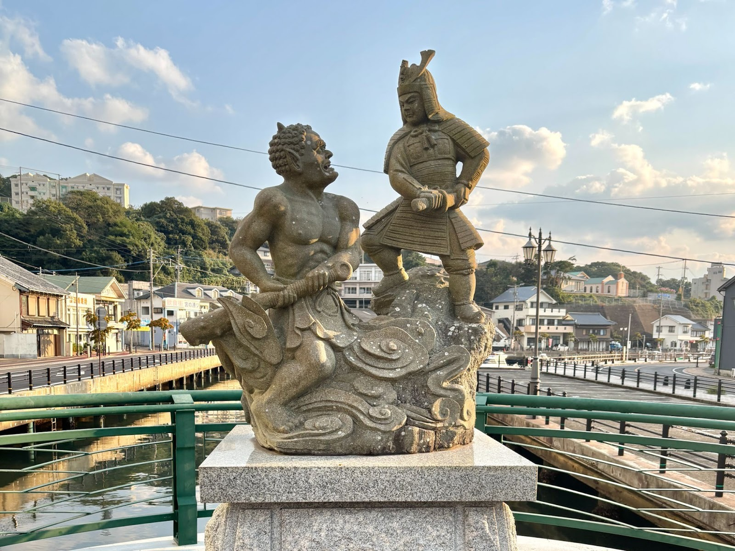 郷ノ浦を歩いていると、橋の中央に石像が置かれていました。