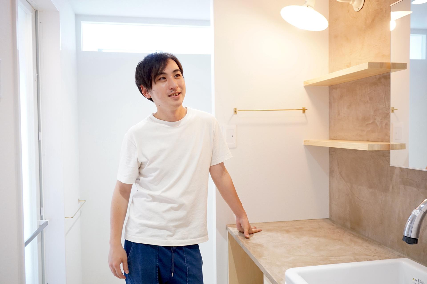 お客さん自身が共働きで、生活動線をすごく気にされていて。さらにディレクターからの話で「お客さまは物件探しの頃から『一ヶ所にひとつの用途はもったいない』とおっしゃっている」が上がっていたので、プランの際に「廊下に洗面所を作る」プランに至りました。