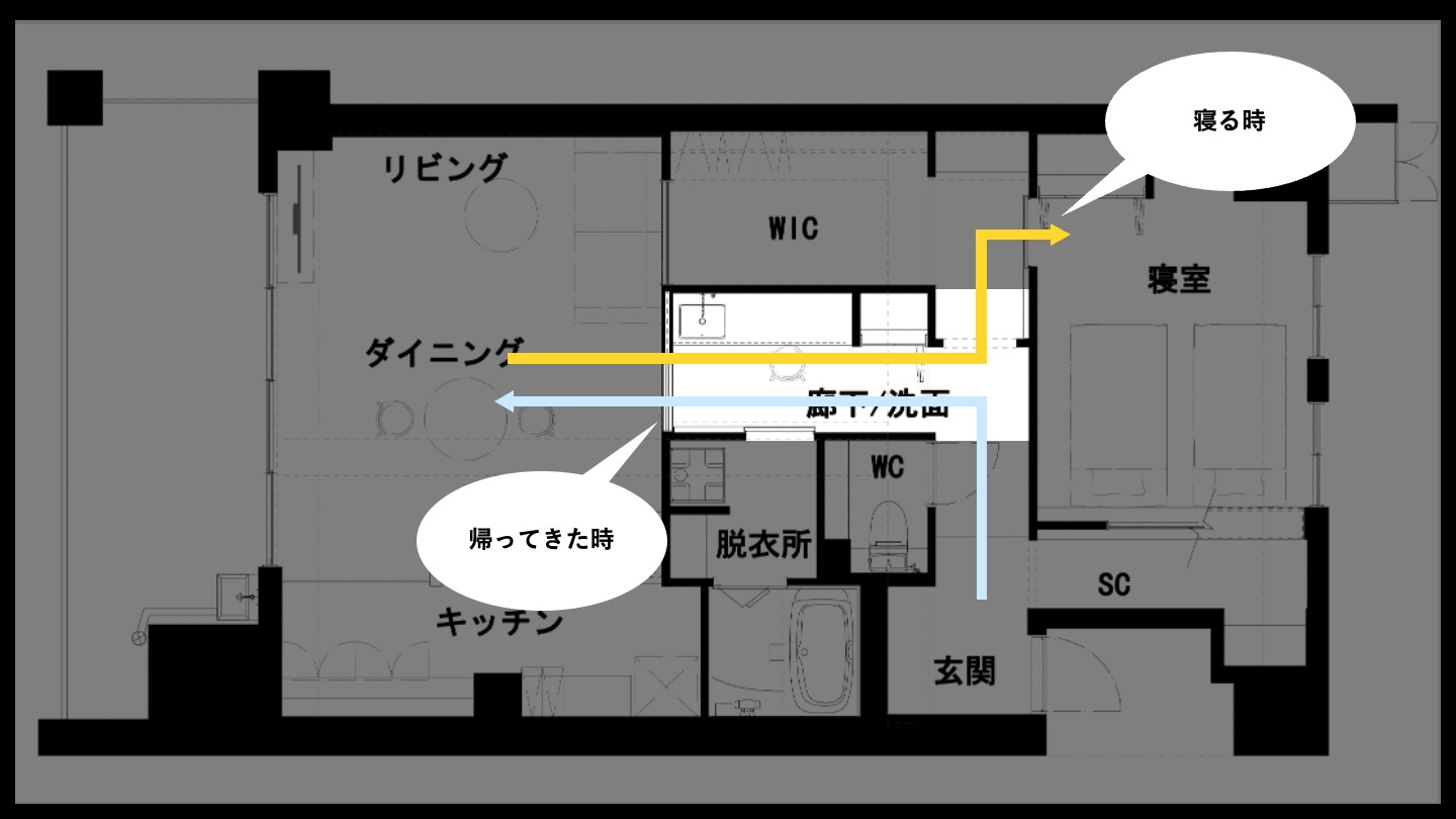片山:洗面所って帰宅後にも使うし、寝る前にリビングから寝室に行く時も使うので、生活上よく通るところに配置しました。