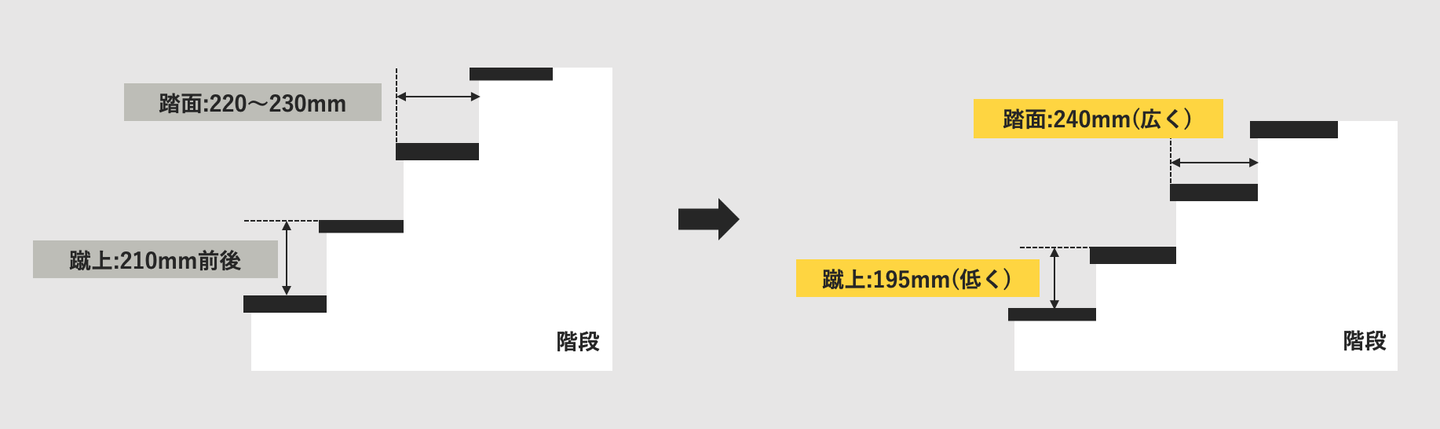 片山:一般的な階段の影は210mm前後なのを、ここでは195mmに低くしました。さらに踏面は一般的に220〜230mm程度なのを、240mmに広く設計しています。