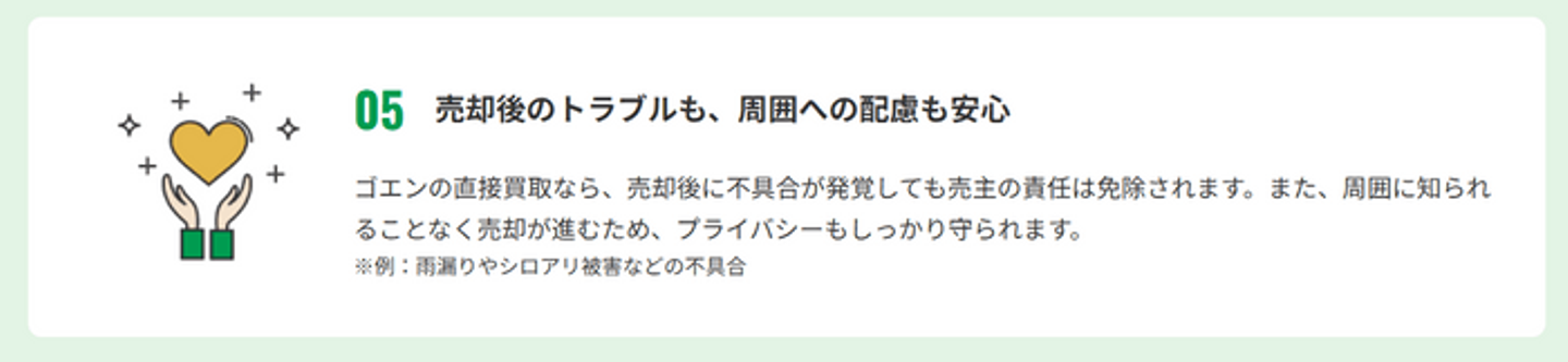 また、近隣の住民の方々に家を売ったことを知られたくないという場合でも、ゴエンならプライバシーを守り安心して売却の手続きを進めることができます。