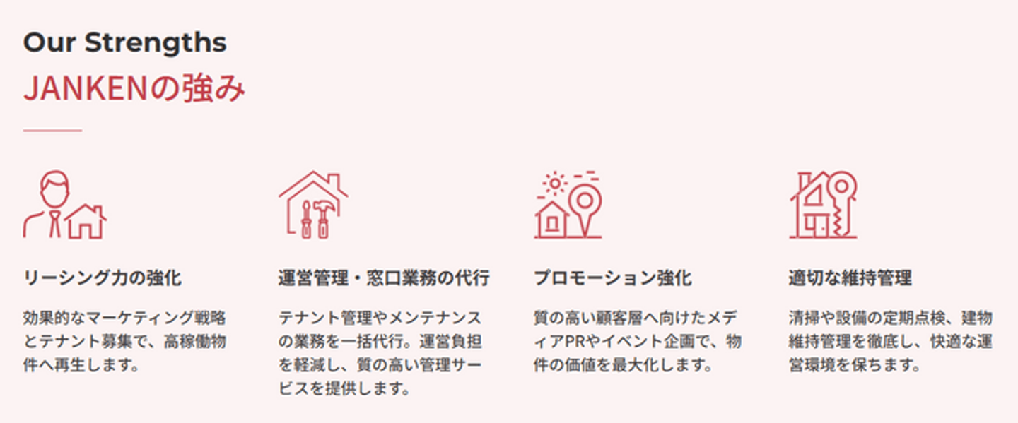 今回のリニューアルを機に、現在当社が提供している「不動産購入サービス」「民泊投資サービス」「リフォーム・リノベーションサービス」の3つを分かりやすく掲載。各サービスごとに詳細を知ることができるページも用意し、「JANKENが、クウカン株式会社が何をしてくれるのか」を明確にお伝えできるようになりました。そこでJANKENのサービス内容をご紹介します!