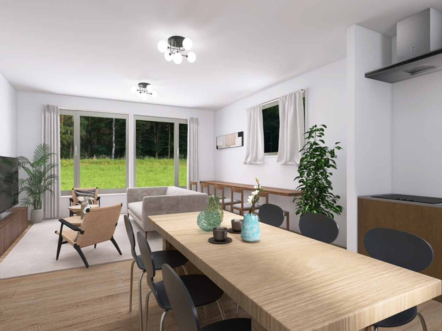 パース図とは、簡単に言えば完成予想図のようなものです。「この壁紙を貼ったら、このインテリアを置いたら、部屋の雰囲気はどんな感じになるだろうか。」「ベッドはどこに置くべきだろうか。」こういった内装設計・インテリア選定の段階で生じる疑問は、詳細な完成予想図を作ることによって解決することができます。「Furano Ezo Murasaki A」のパース図は次のようなものになります。