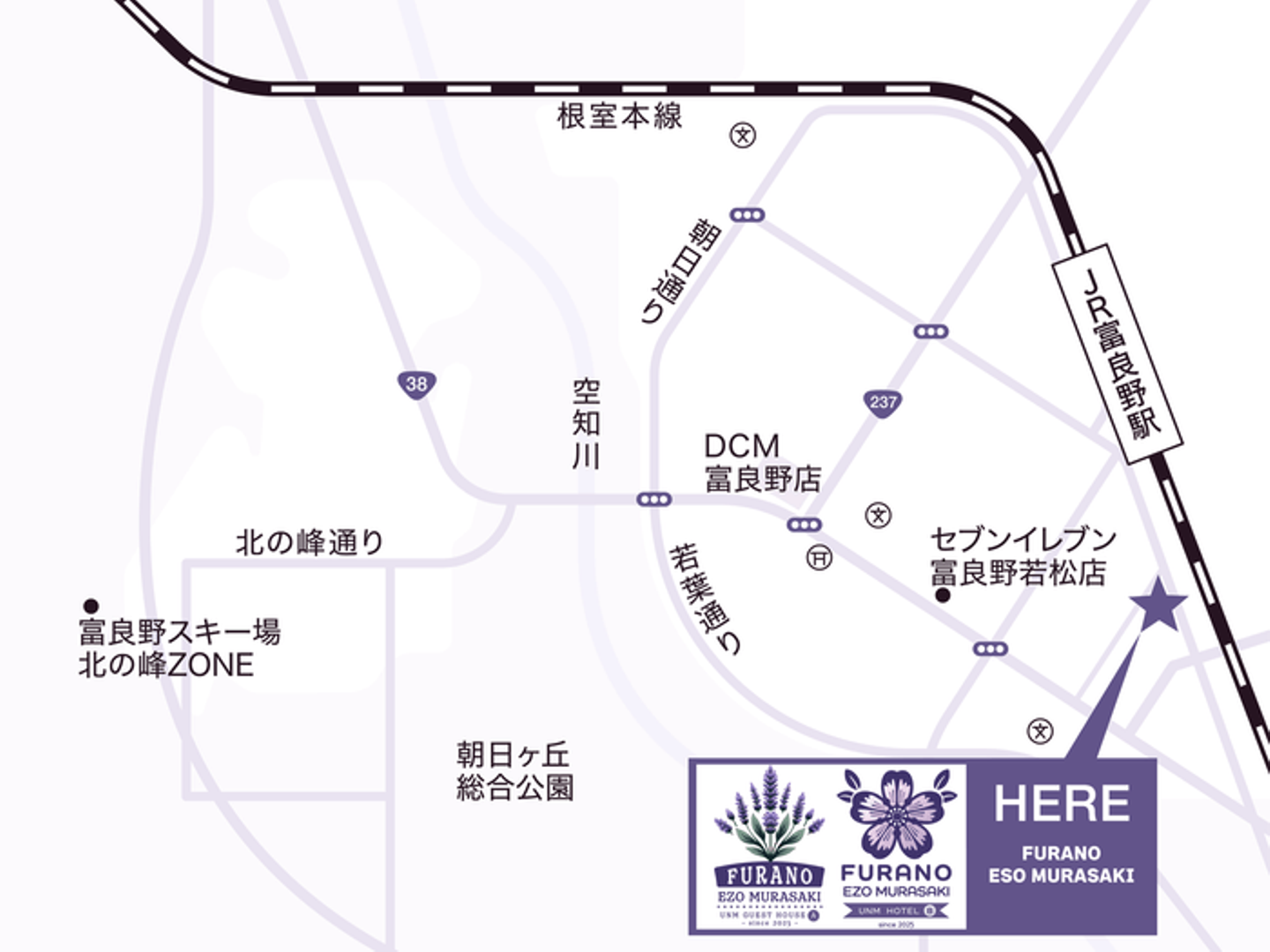 「Furano Ezo Murasaki A」の顔となるロゴと周辺マップと間取り図のデザインも当社が担当しました。夏の富良野の代名詞ともいえるラベンダーをあしらった、紫色を基調としたデザインです。