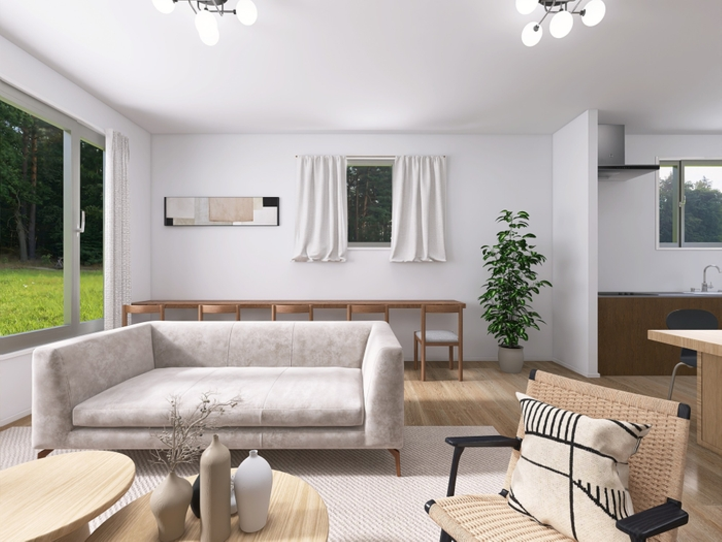 まるで実際の部屋を写真で撮ったかのようなクオリティです。デザイン・インテリア選定を、このようにデジタル上で詳細な箇所まで詰められるパース図は、