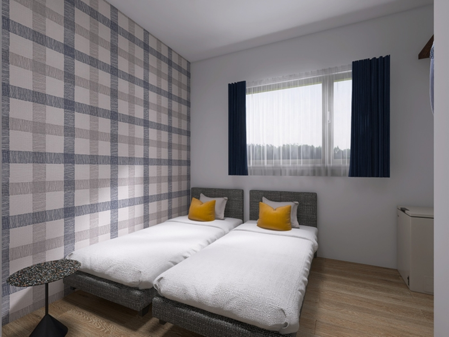 当施設は2階建てとなっています。1階は、後述するオフィスルームとリビング・ダイニング・キッチンが大部分を占めており、主に日中の利用が想定されています。一方、2階は、ベッドルームが並んでいることから、主に夜間の利用が想定されます。