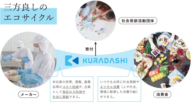 KURADASHI(https://www.kuradashi.jp/)は、フードロス削減への賛同メーカーより協賛価格で提供を受けた商品を最大97%OFFで消費者(会員)へ販売し、売り上げの一部を社会貢献活動団体へと寄付する日本初・最大級の社会貢献型フードシェアリングプラットフォームです。環境保護や動物保護の団体、新たに設立したKURADASHI基金など、全19団体を支援しています。