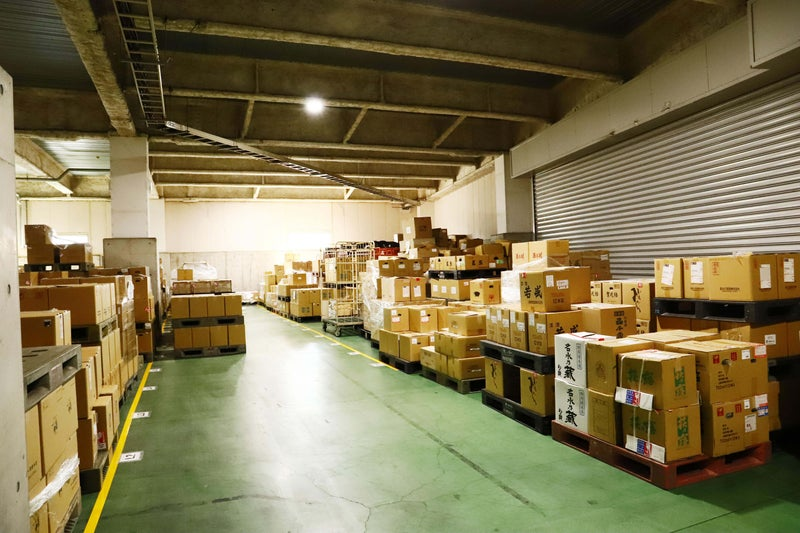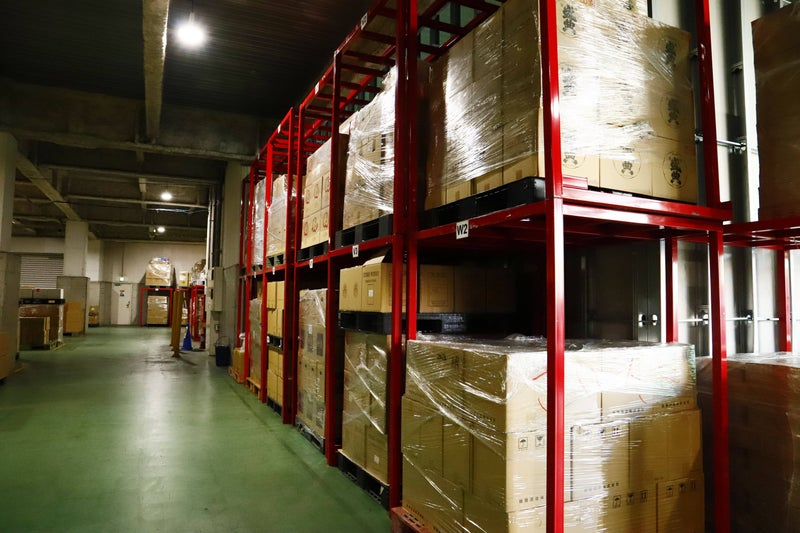 主に配送業務を行うA棟と、商品の荷受け、保管を行うB棟にわかれていて、広さは約2,500㎡。最大約25万本ものお酒を保管できます。