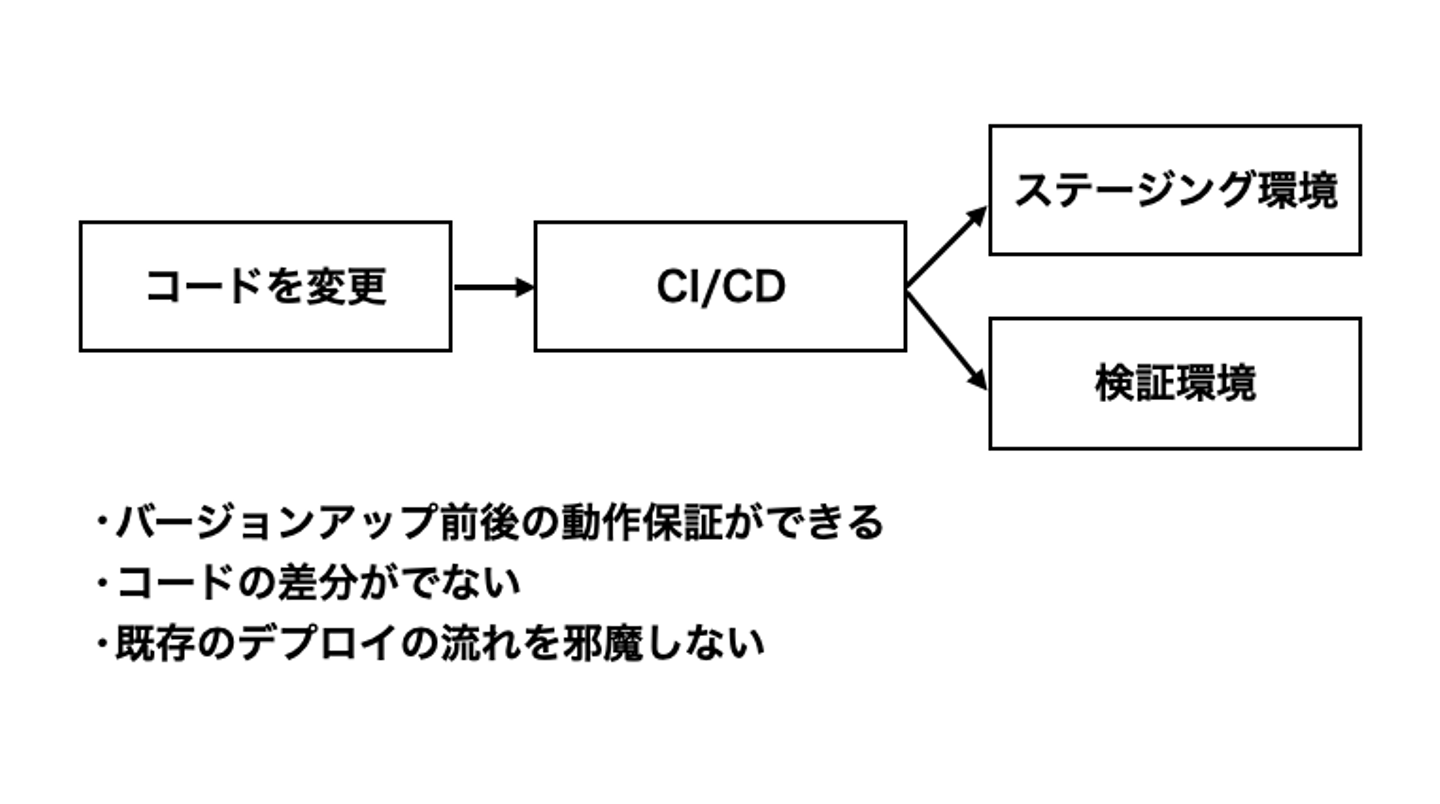 - 他のプロジェクトなどバージョンアップとは関係ない修正もあるため、既存のデプロイフローは変えず、いつでもリリースできる状態にしたい