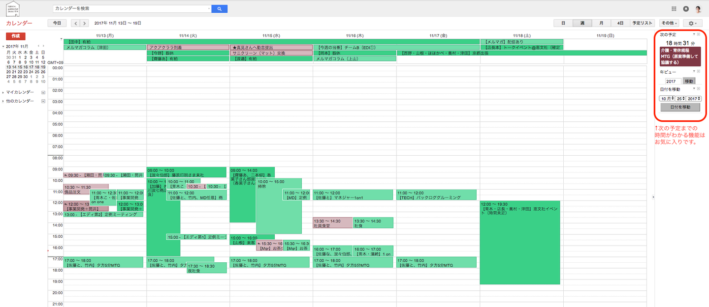 今のところ、全社的な予定は(1)のクラシコムカレンダーで管理しているので、各個人の予定は、To do的に使ったり、作業予定をしっかり入れたり、ほとんど使っていなかったり、人によって使い方はそれぞれです。