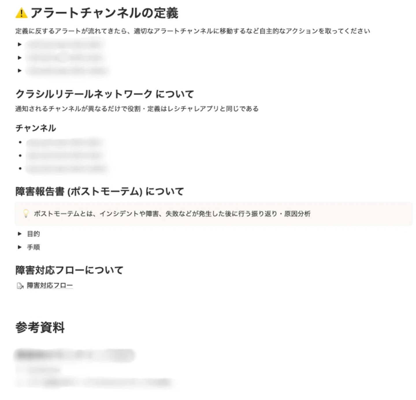 Alertチャンネル ここに上がったものはインシデント扱いとなり、即座に担当者を選定して対応することが必須です。 Warningチャンネル: パフォーマンスの劣化や、放置するとインシデントに発展しうる要因を早期に検知するためのチャンネルです。ここに上がったものは即時対応までは求めないものの、担当者と対応期限を明確にすることが義務づけられています。