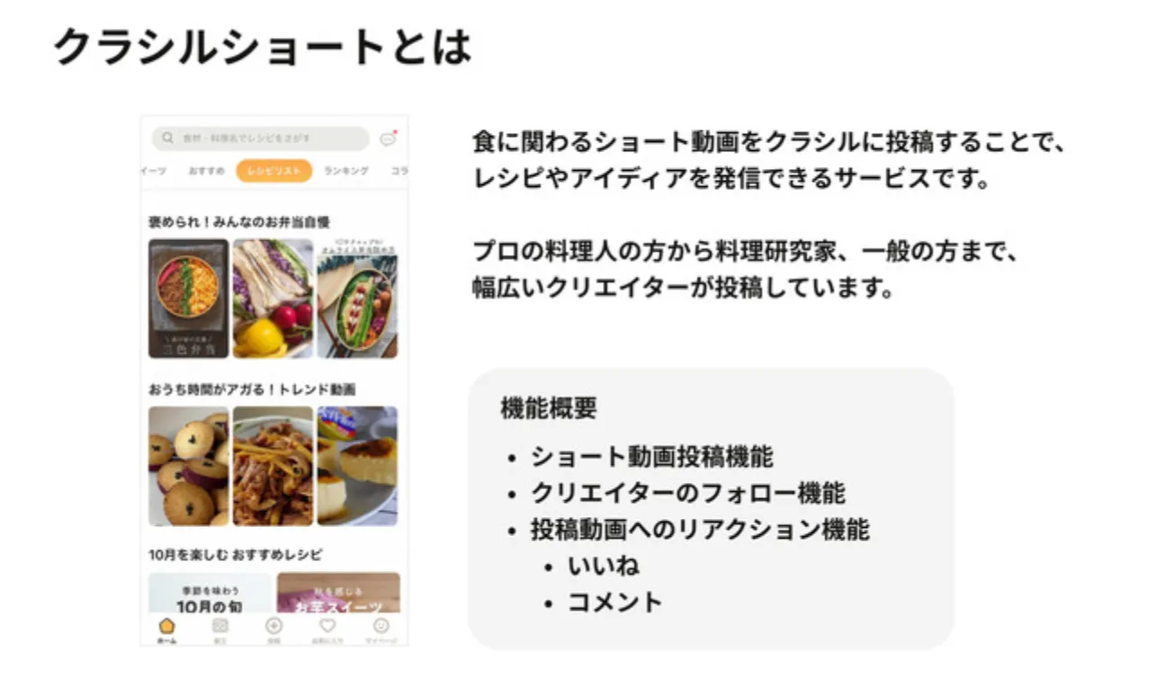 昨年ローンチした「クラシルショート」も弊社ならではの価値をお届けできるサービスのひとつですね。食の領域に特化したユーザー投稿型のショート動画サービスで、弊社がスカウトした食意識・発信意欲の高いクリエイターの方々に参加いただいているので、クオリティの高いコンテンツが充実しています。