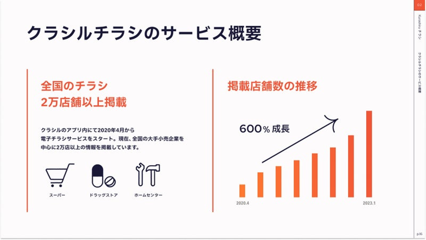なかでも、レシピ動画サービスとして開始した「クラシル」はコンテンツ数世界No.1(*2)を達成。加えて、そのユーザー基盤を活用したチラシ事業(クラシルチラシ)も堅調に伸長しています。