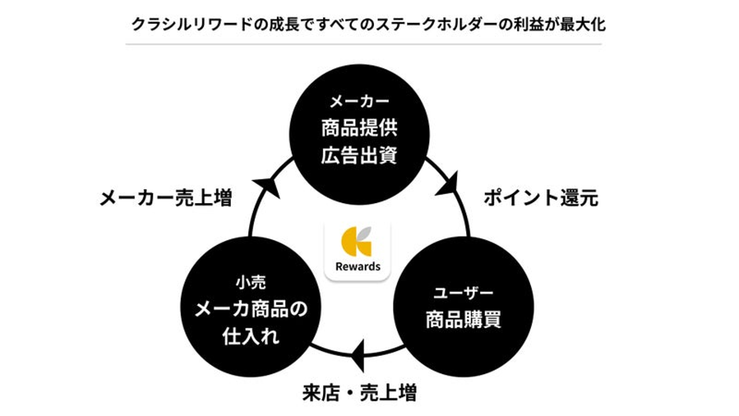 この2つの戦略により、メーカー様が「クラシルリワード」に広告出資し、ポイント還元商品を提供します。ユーザーにとっては「クラシルリワード」を利用すればするほどお得なわけですから、「クラシルリワード」が対象となる店舗に足を運び、商品を購入します。当然、小売企業様の利益にもつながり、「クラシルリワード」を活用するメーカー様の商品を多く仕入れます。「クラシルリワード」が成長すればするほど、全ての方に大きな利益を還元できるのです。