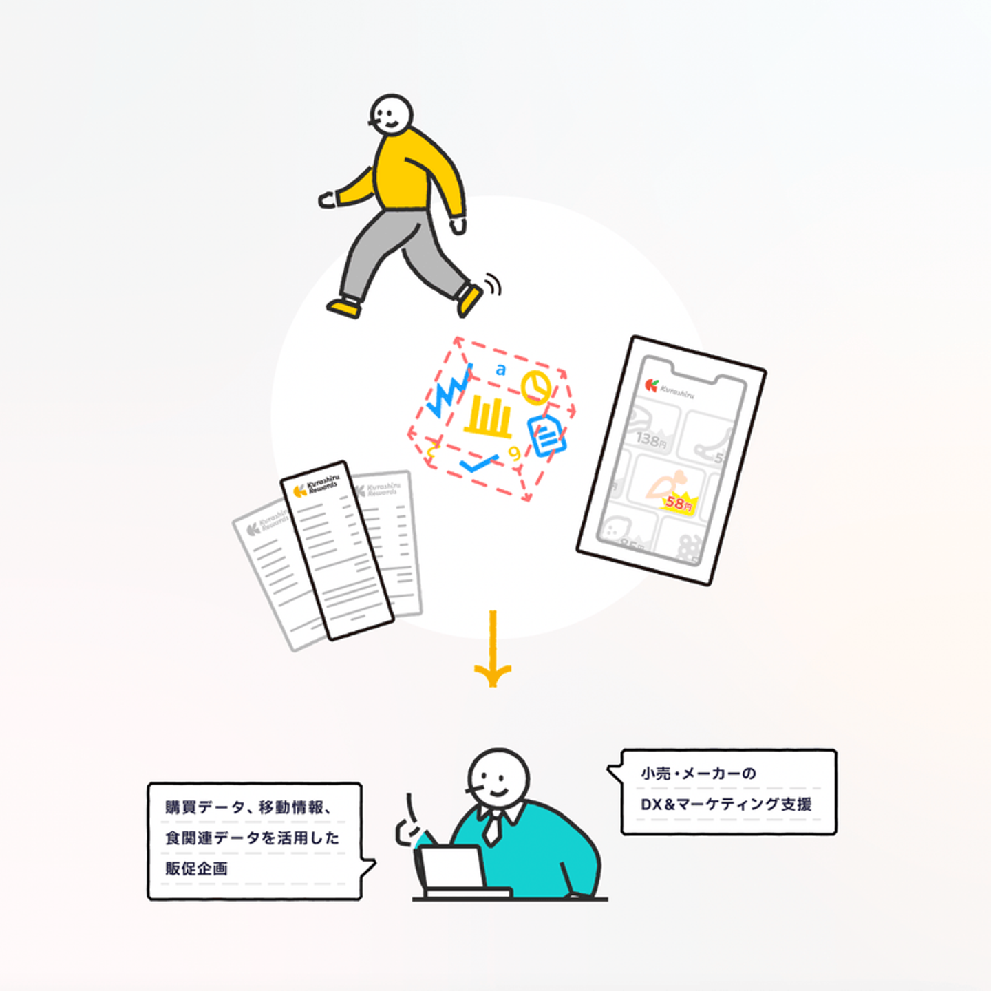 そして、日常生活でアプリを使っていただくことで集積されたデータを活用し、ユーザーの方にはより良いコンテンツを提供、食品メーカーをはじめとする企業様には買い物に関する様々なマーケティング支援を行っています。