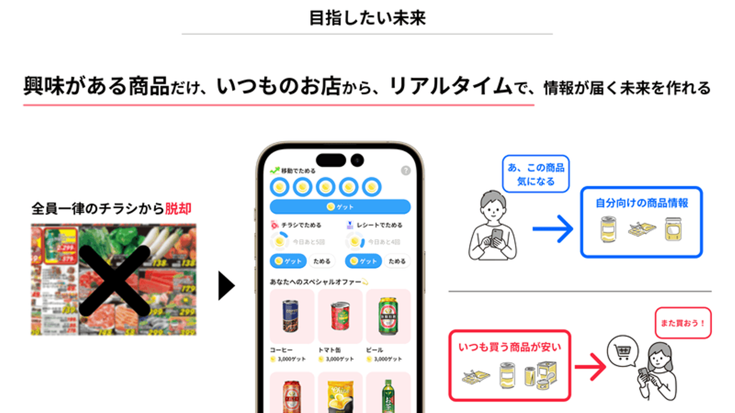 デジタル業界がリスティング広告からアドテク・SNSへと変わりゆく一方で、現在小売店からの訴求は全国一律のチラシがほとんど。これを脱却し、ユーザーデータを元に、パーソナライズして興味がある商品だけ、いつものお店から、リアルタイムで届くような未来を作っていきたいと私たちは考えています。