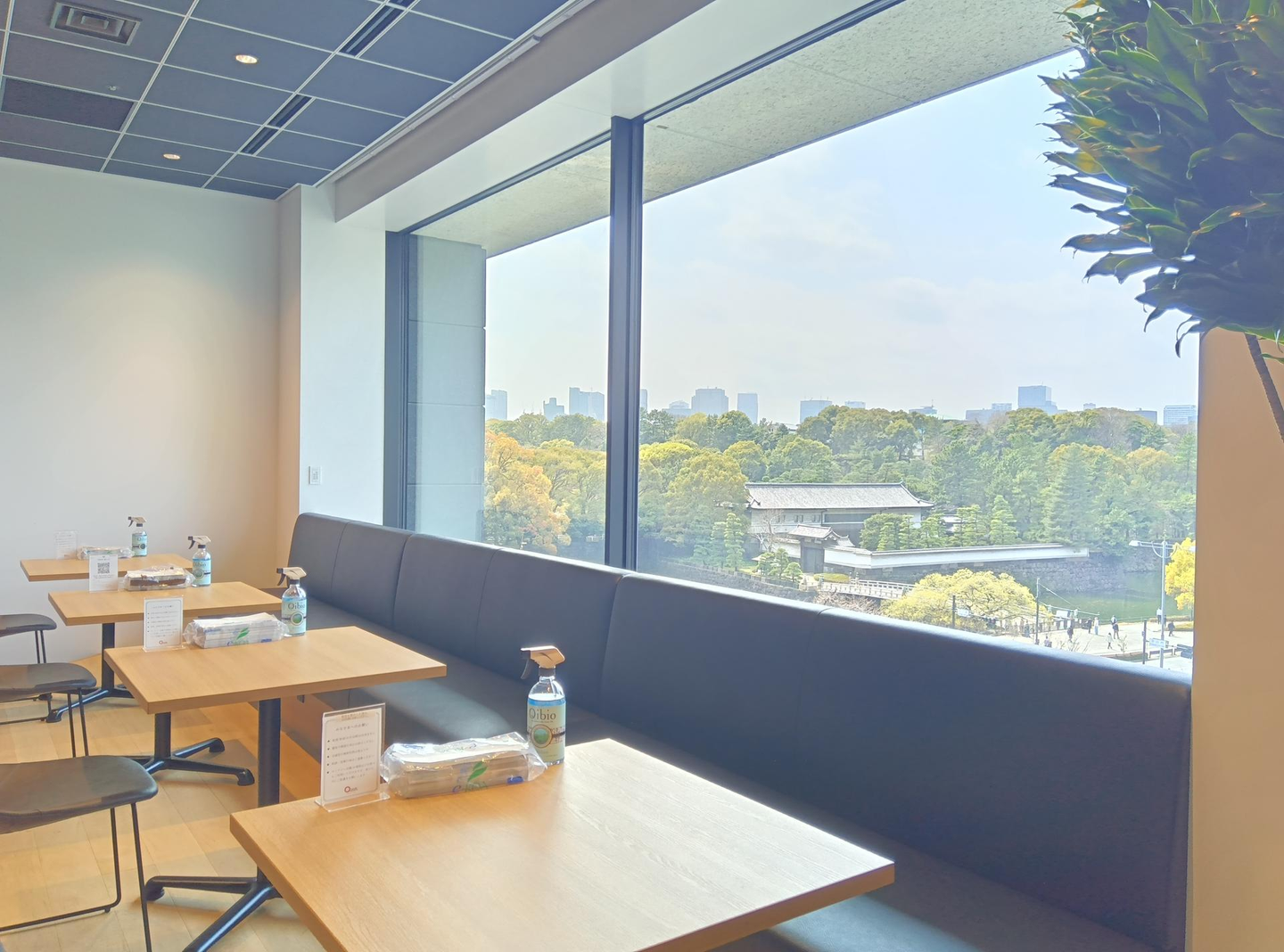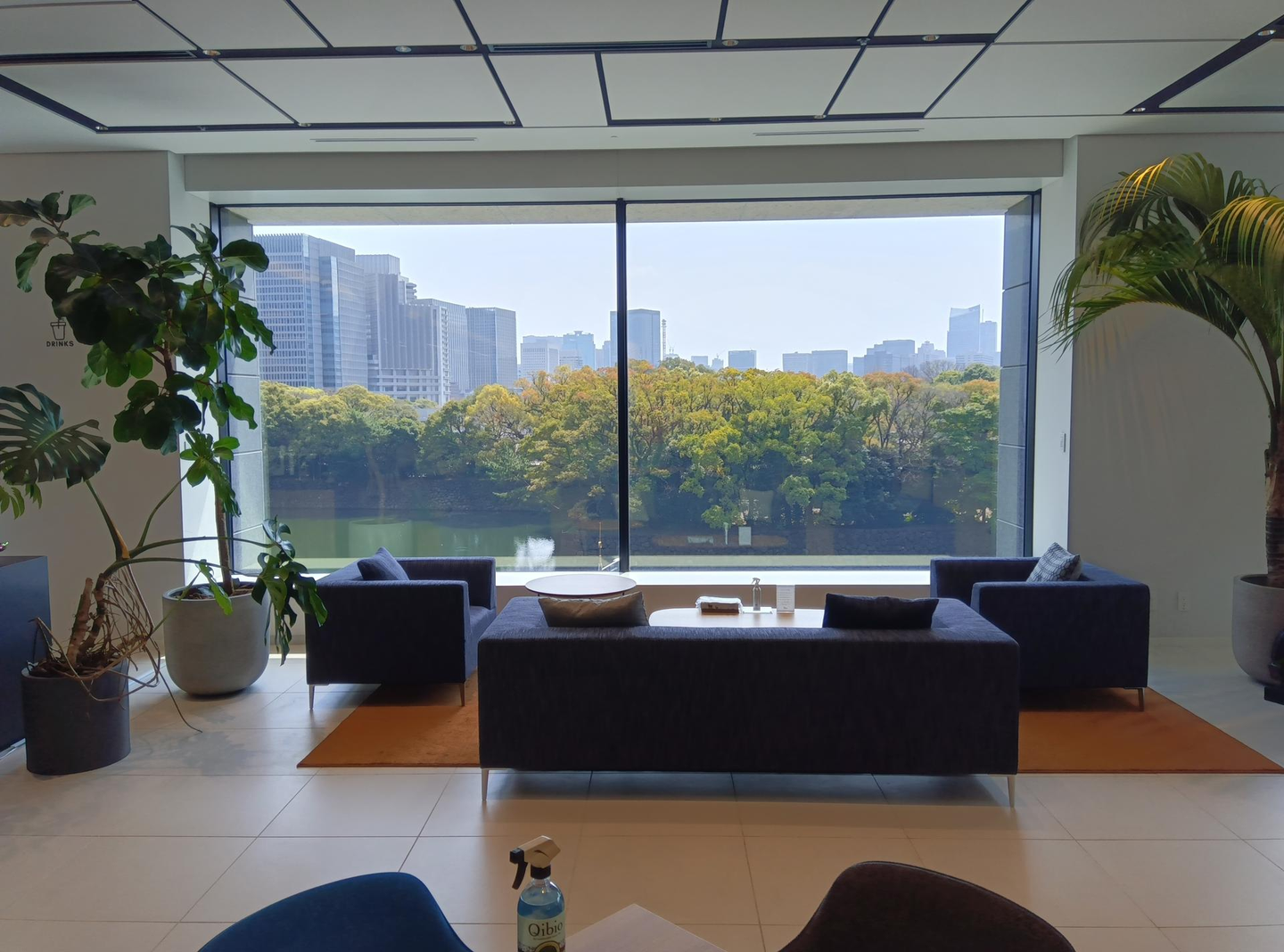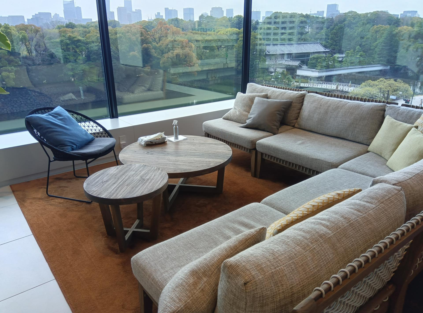 ラウンジに入るとまずはこんな感じ。大きな窓一面に皇居が見えてとても明るく開放的です。