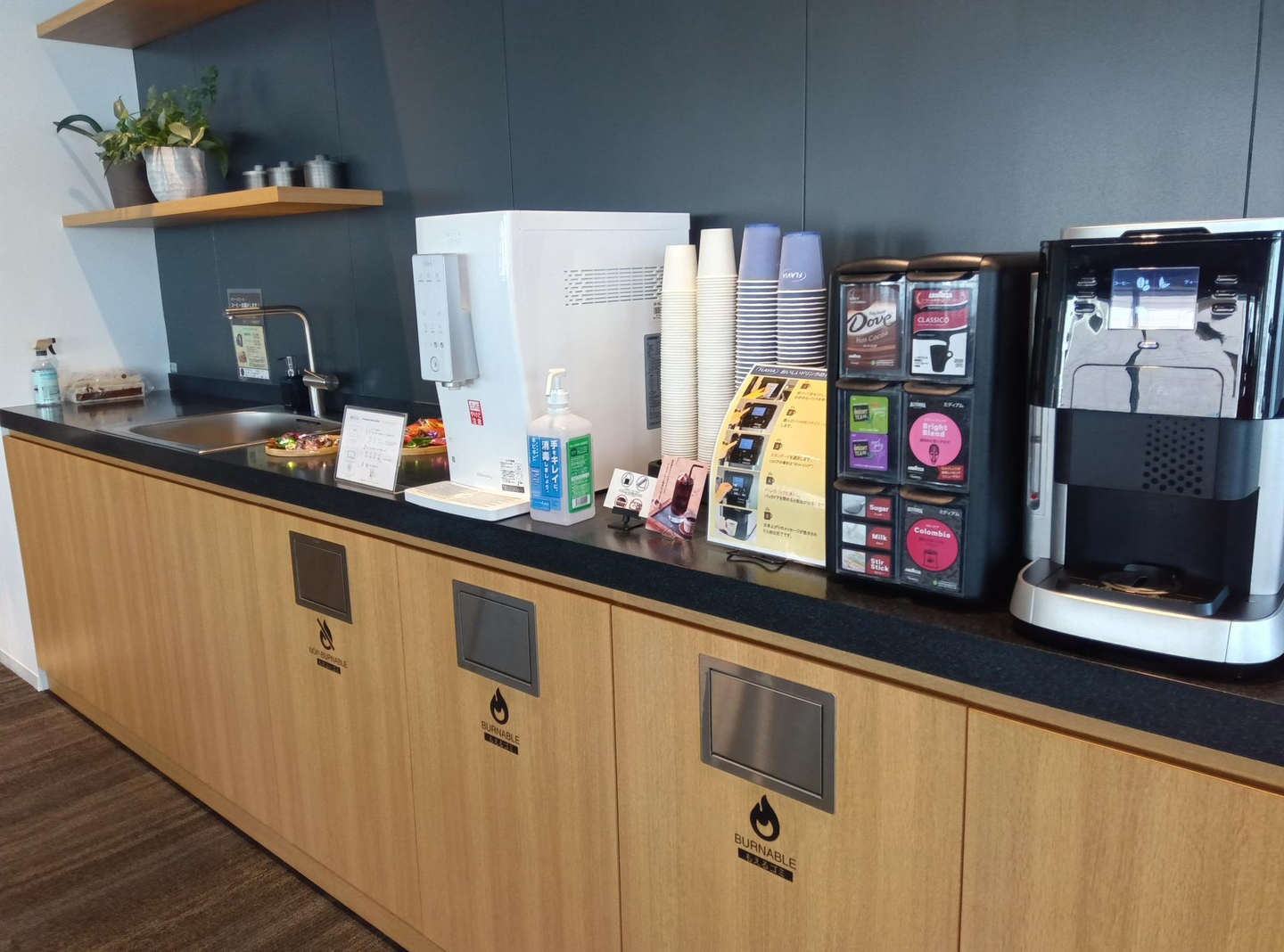 コーヒー、紅茶、お水、個装のちょっとしたお菓子を自由に頂くことができます。