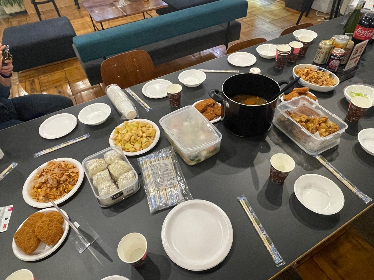 一方、意外にも「多様性」によるもう一つの良さは、色んな国のグルメを食べれることです(笑)。下の写真は、去年の忘年会です。みんなは自国の手料理を持ってきて分け合って食べました。やっぱり、ベトナム春巻きはおいし〜いですね。