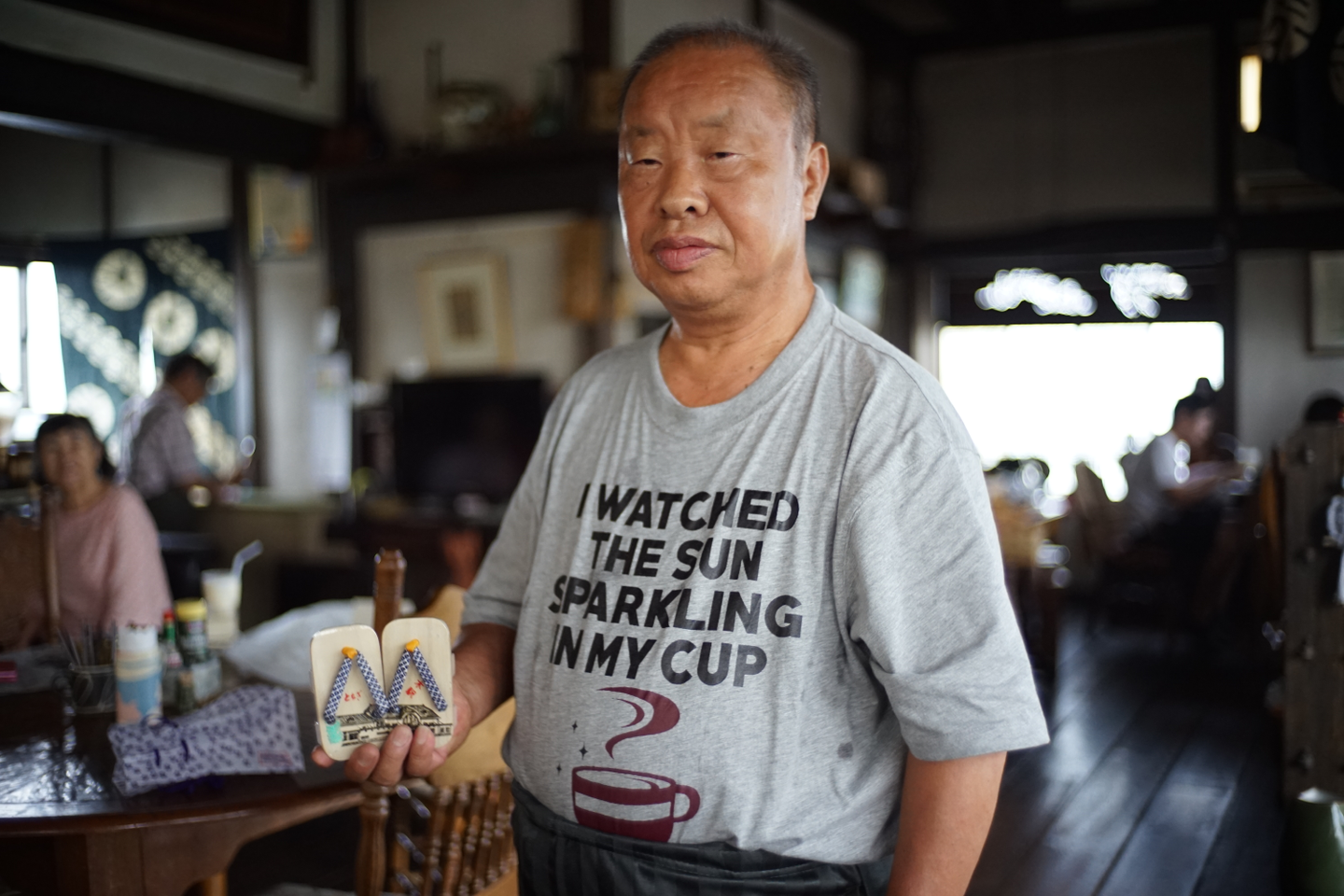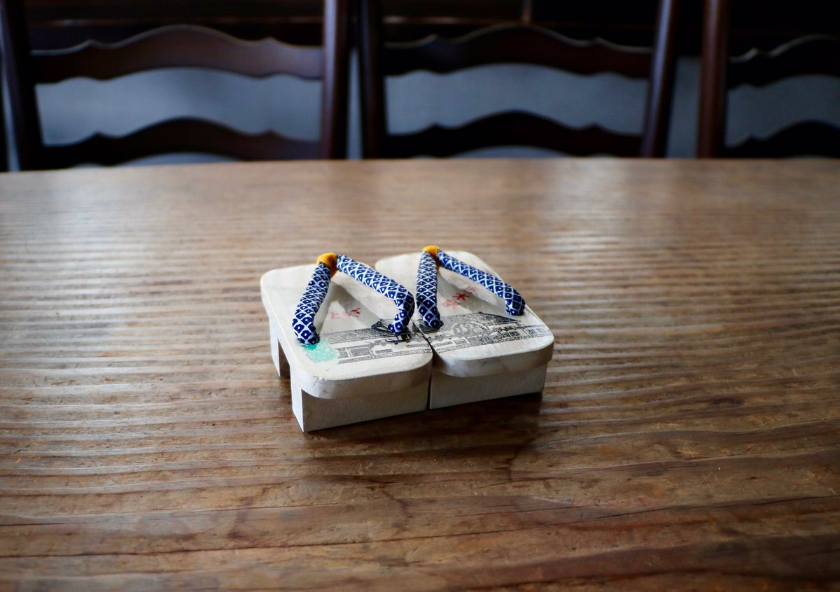 突然のテヅカさんの登場に最初は戸惑ったものの、すっかり意気投合。小さな下駄のプレゼントをいただきました。下駄は栃木の名産とのこと。