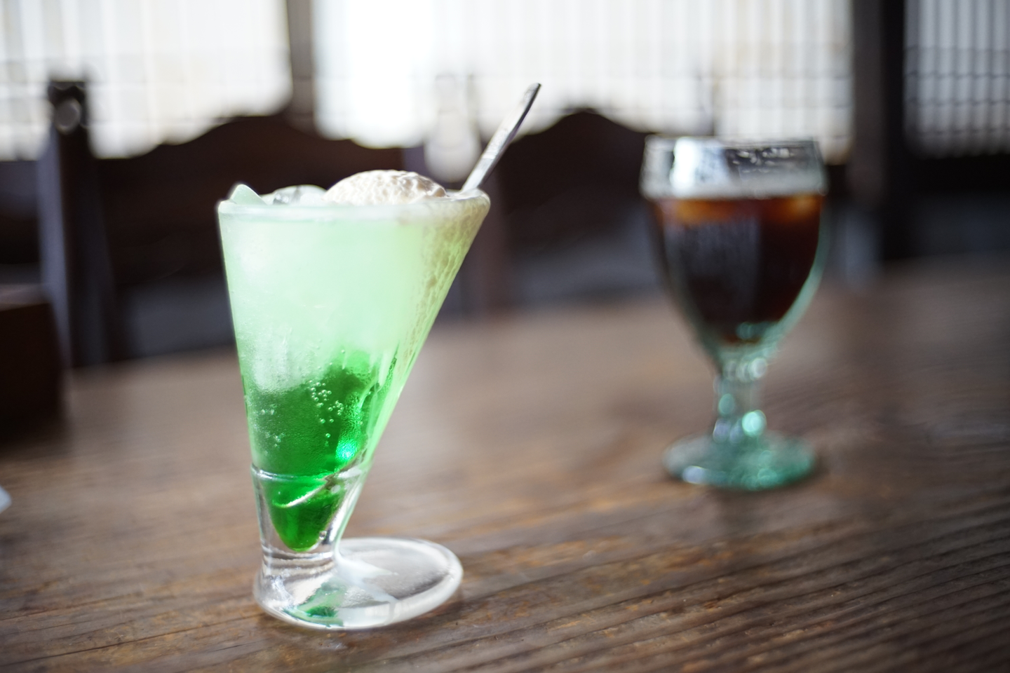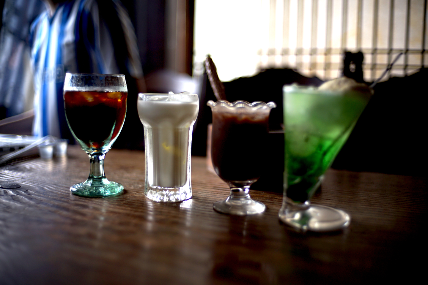作業していると、注文した飲み物が来ました。左からアイスコーヒー、アイスミルク、アイスココア、クリームソーダです。飲み物によって異なるグラスがオシャレですね。