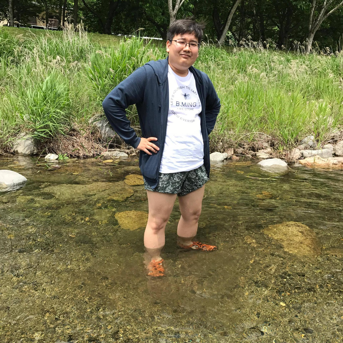 お酒を飲んで気持ちよくなったのか、なぜか川に一人入る社長(インターン生)。
