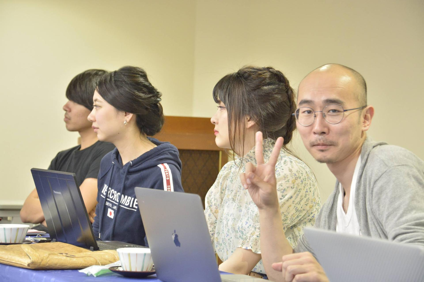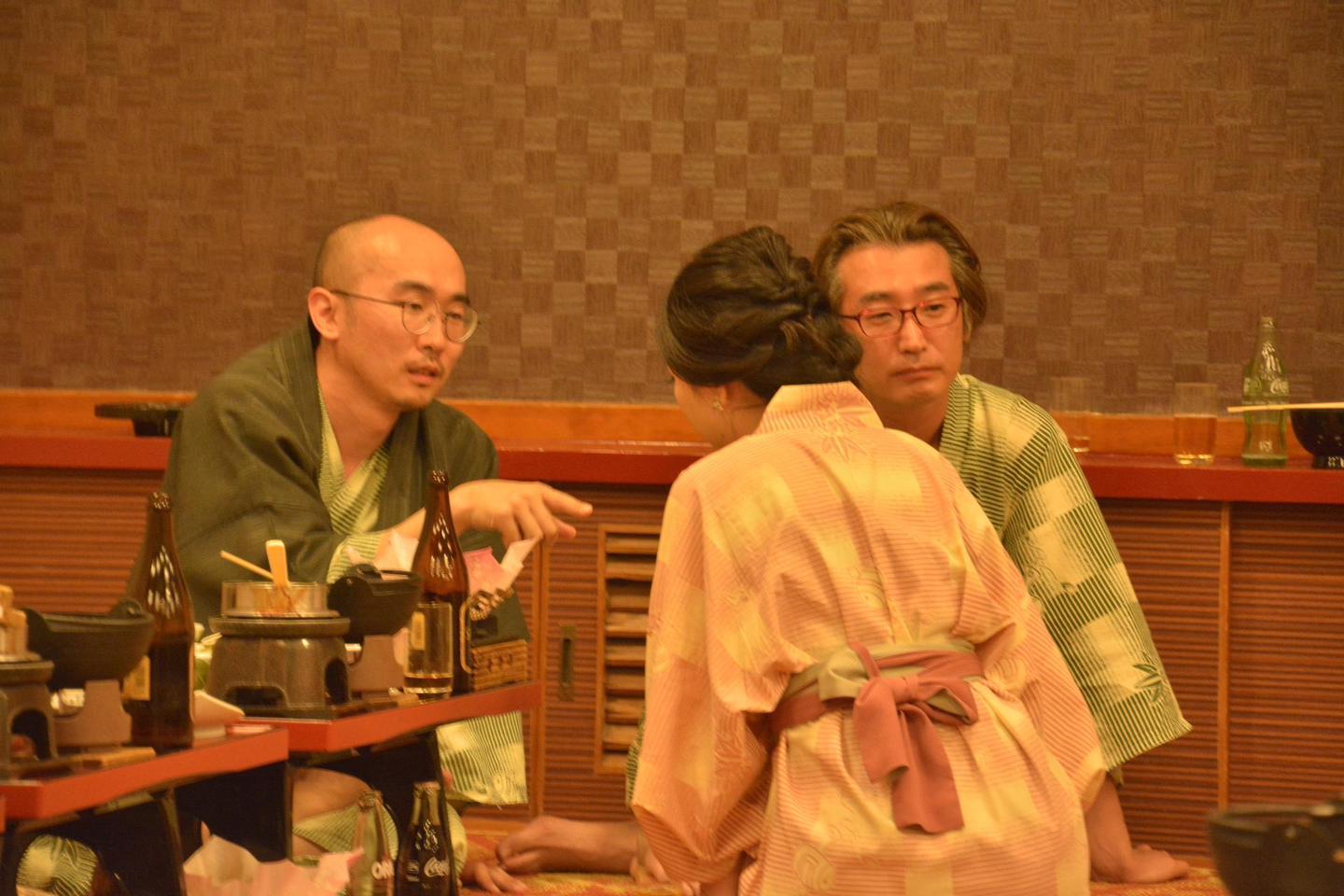 旅館についてすぐですが、みんなで一日の総まとめのため旅館で会議中。