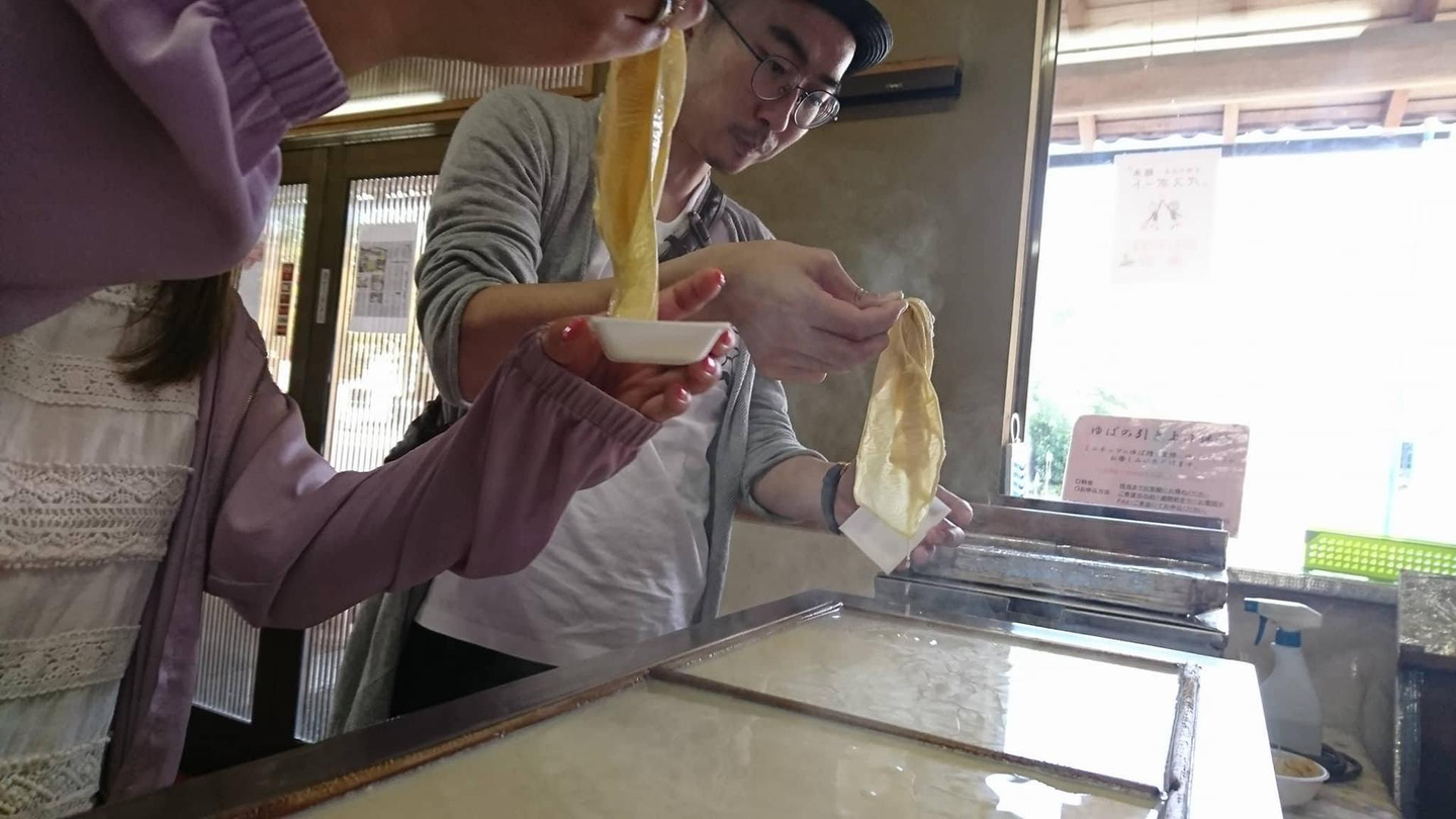 おじさんたちがせっせと栃木県名物の「湯葉(栃木では湯波)」です。