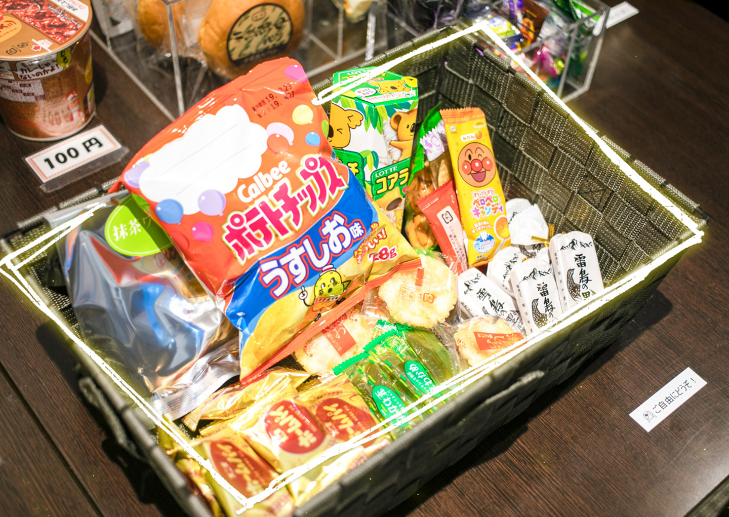 甘いのもしょっぱいのも入っているこのカゴの中は自由に食べ放題!