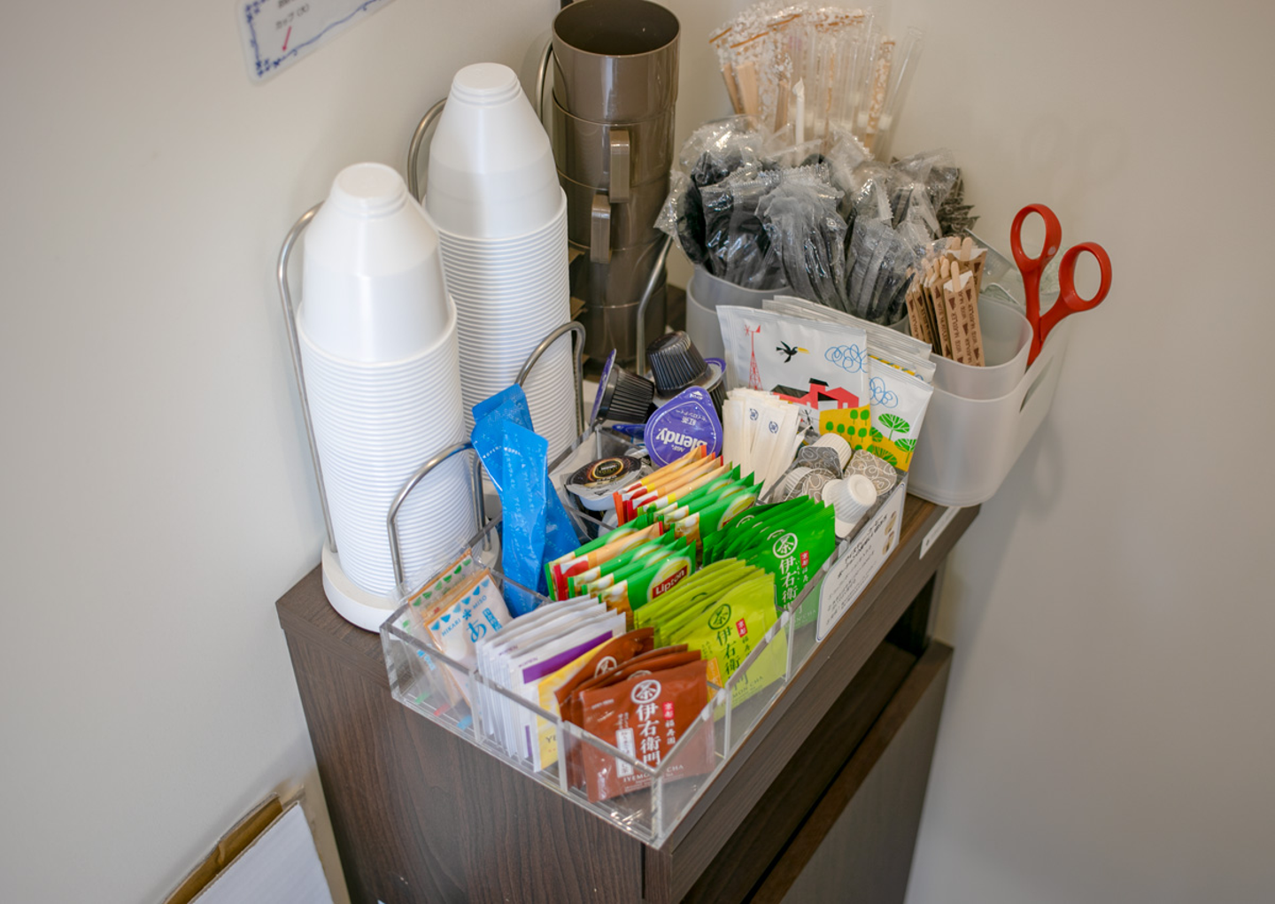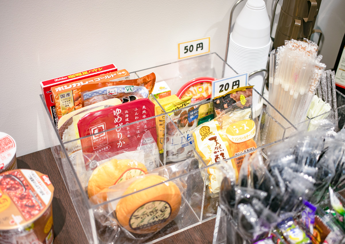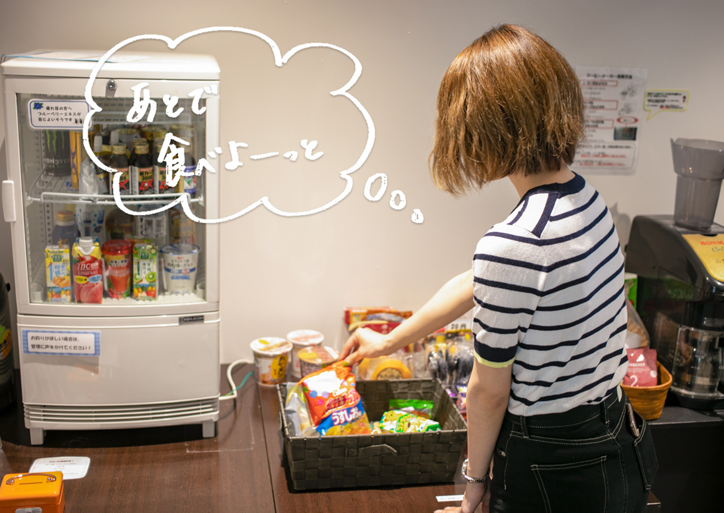 カフェスペースには、食べ放題のお菓子とお財布にやさしい価格のドリンクが置いてあります。