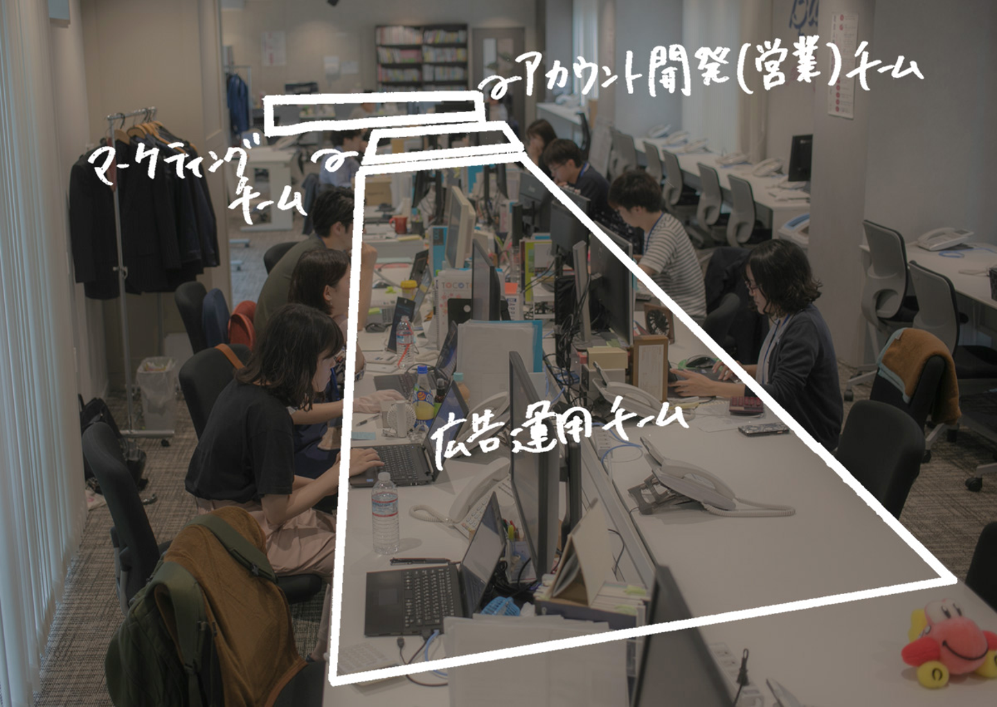 入口側(写真奥)から、アカウント開発(営業)チーム・マーケティングチーム・広告運用チームという配置です。