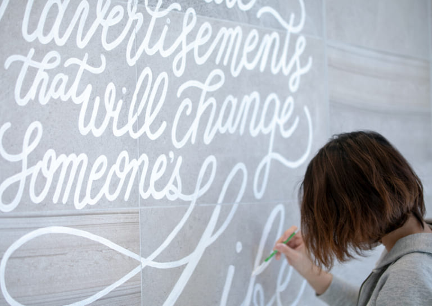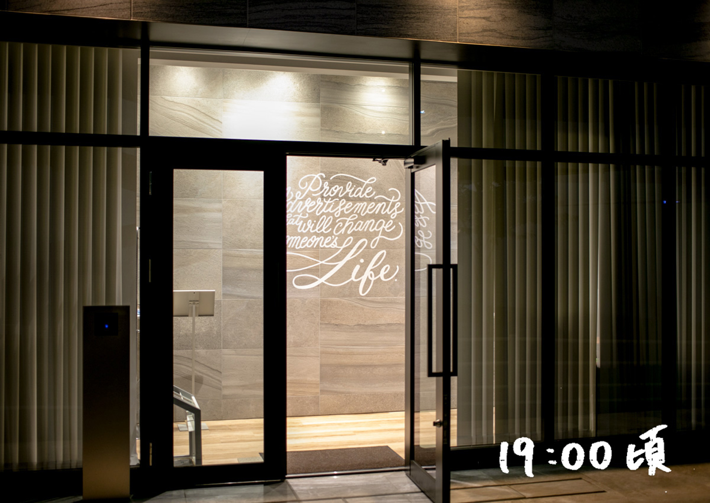 外からも見えるオフィスアートは、キーマケのミッション「誰かの人生の、分岐点になる広告を。」の英語バージョンです。