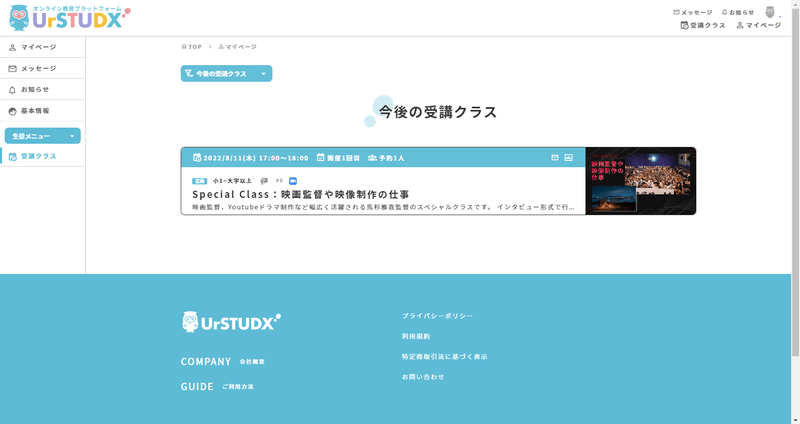 マイページから受講予定のクラスがいつでも確認可能です。クラスによっては、「メッセージ機能」で先生とのやり取りが必要だったり、参加に必要な準備物がある場合があります。スケジュール欄で開催日時をよく確認し、クラスの説明をよく読んで、たくさんの素敵な授業を楽しんでください。