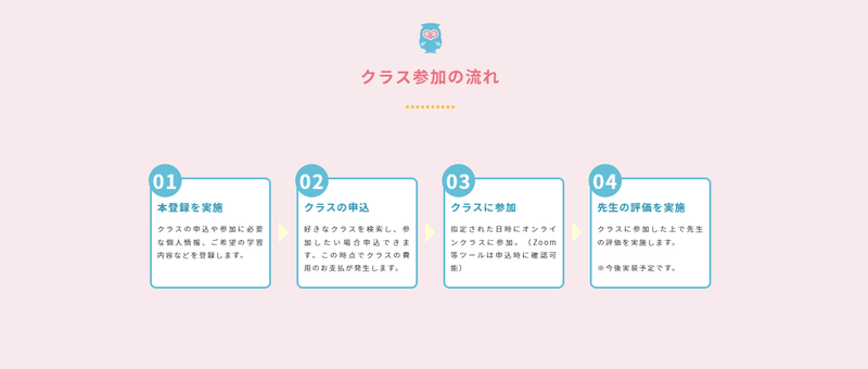 ファーストリリースでは、「サービス登録」及びサービスを試していただくための「無料クラスの参加・開講機能」が開放されました。生徒の皆さんには、たくさんの無料クラスをご体験いただく期間としてご活用いただきたいと思います。