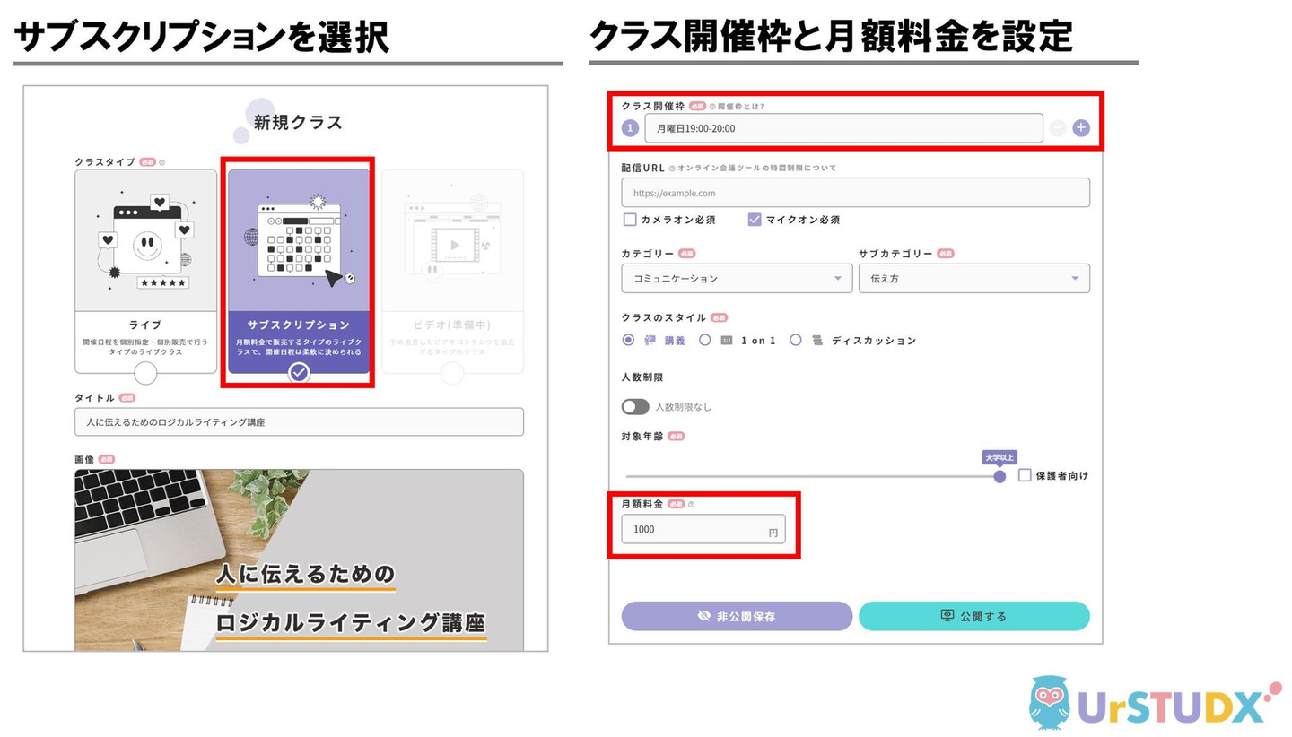 クラス作成時にサブスクリプションを選択し、単発クラスとの違いとして、開催枠と月額料金を設定します。