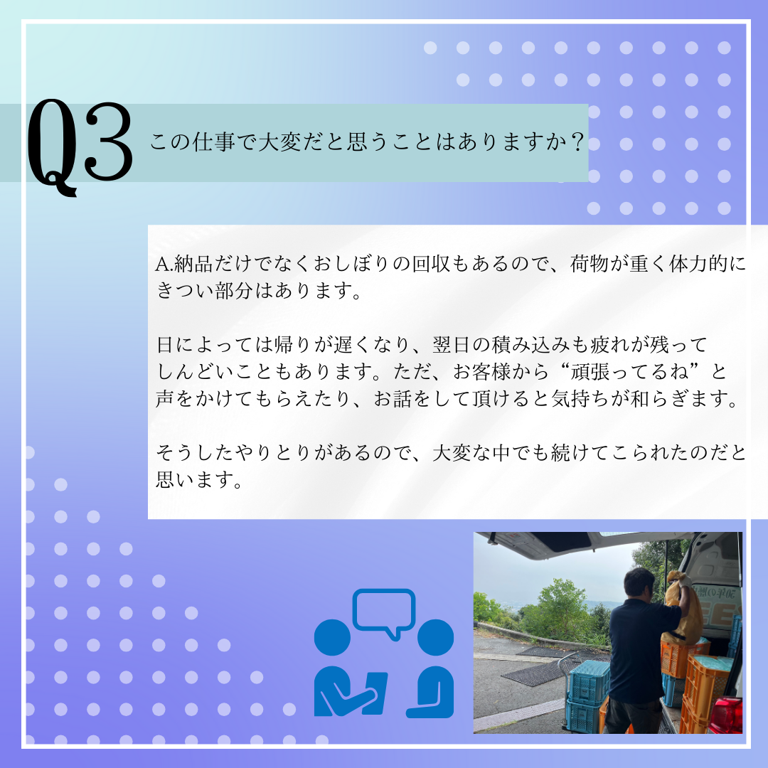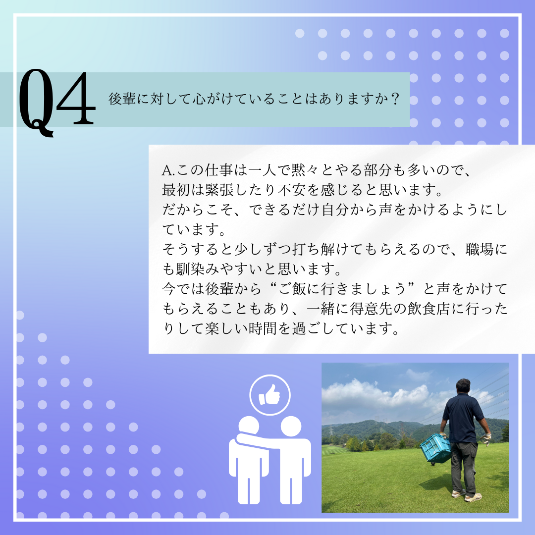 後輩からご飯に誘われたり、新入社員が入ると自分から声をかけてくれるなど、さりげない気配りが印象的でした。