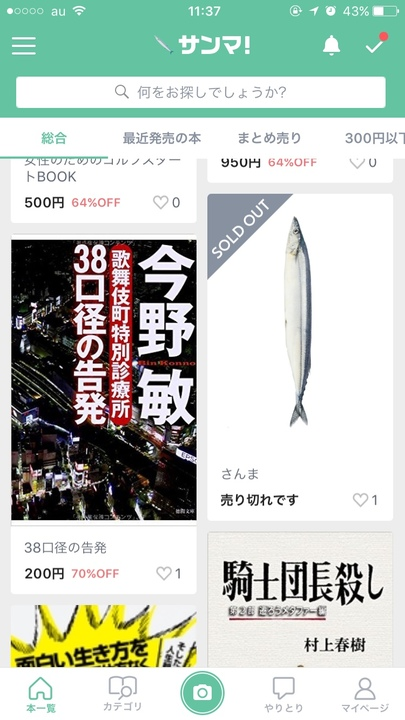 当日、アプリ内で本当にサンマが出品されていました。本にさりげなく混じっているサンマの姿がシュールですね。