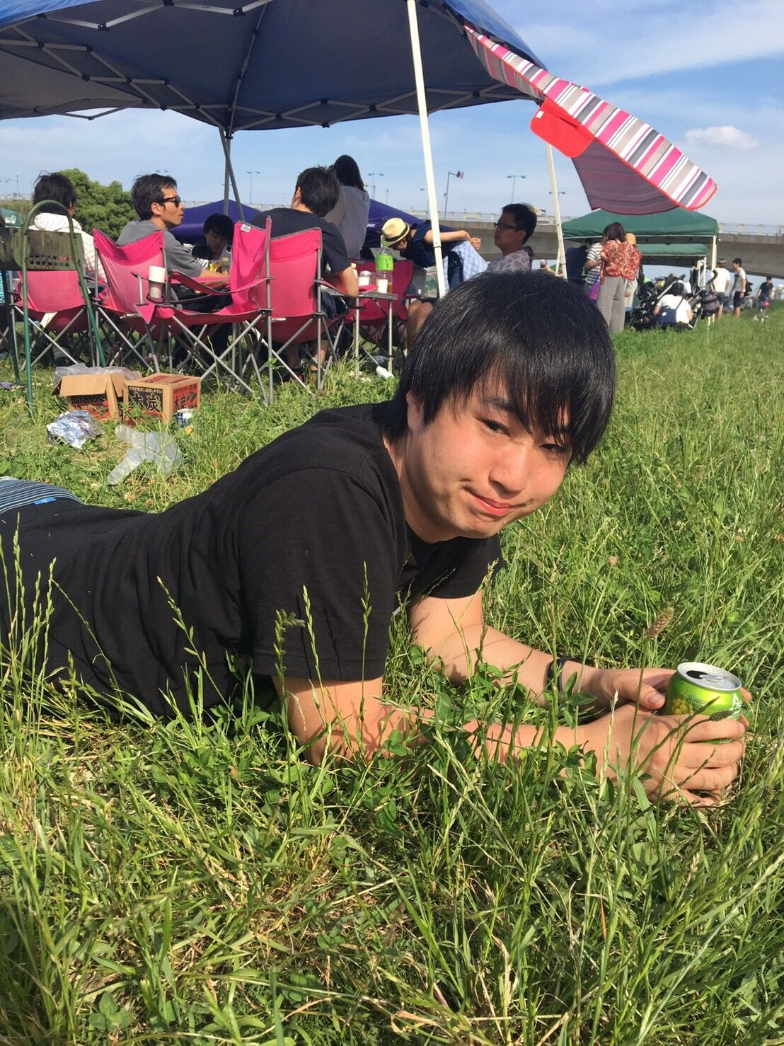 お酒を片手に芝生に横たわり、微笑むもっちさん。今回のバーベキュー中に撮影された写真の中で、私のお気に入りの一枚です!この日は本当に梅雨晴れの一日で、太陽の日差し×緑の芝生の組み合わせが最高でした。