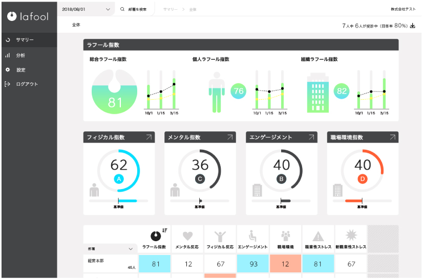 フィジカル・メンタル・エンゲージメント・職場環境の4つの指標に分かれており、この合計が「総合ラフール指数」として表示され、簡単に説明すると、青色が良好、赤色が危険信号となっています。