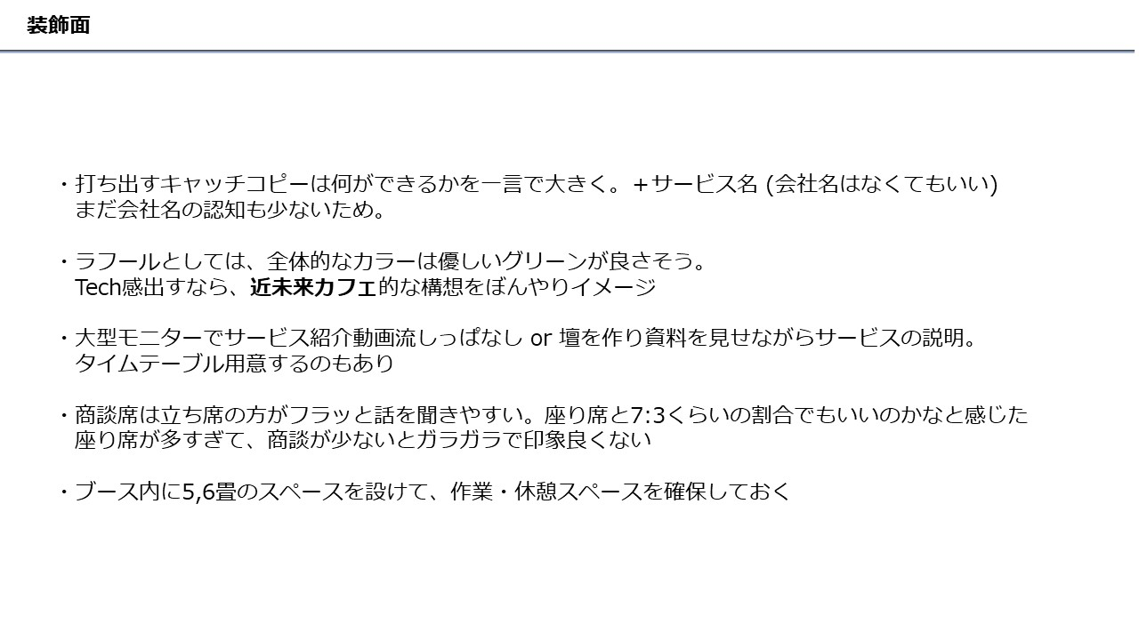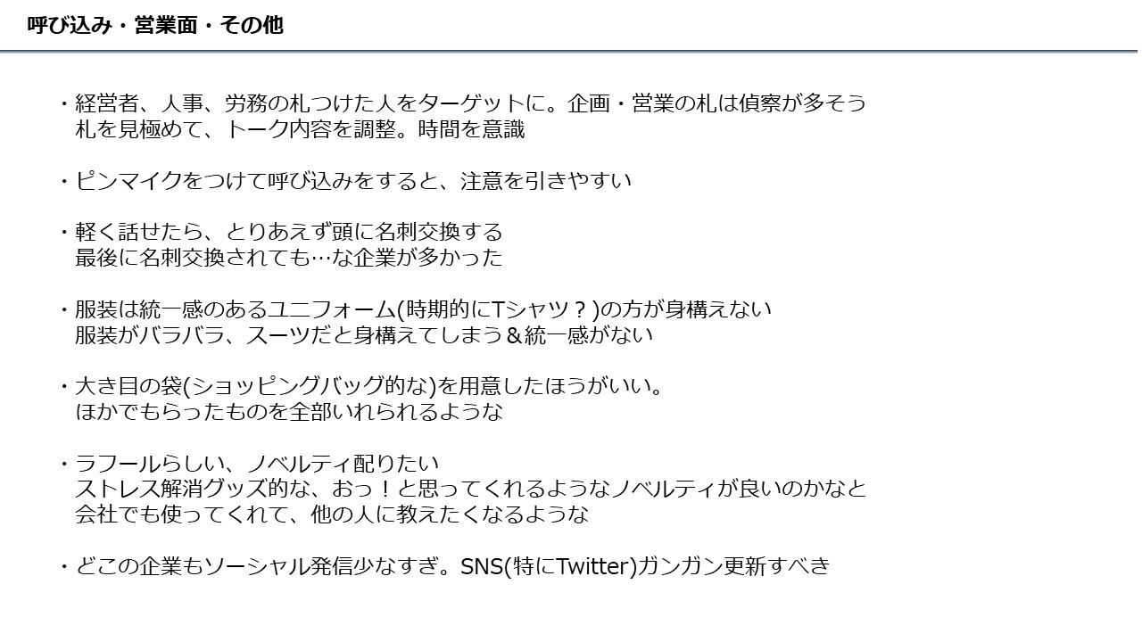 上記のようにブース装飾やキャッチコピーがまとまっていた企業がある一方、サービスを全面的に打ち出しているだけ、クロージングまでの導線がイマイチ?な印象を受けた企業もあり、いざ出展社側として見てみると、たくさんの発見がありました。