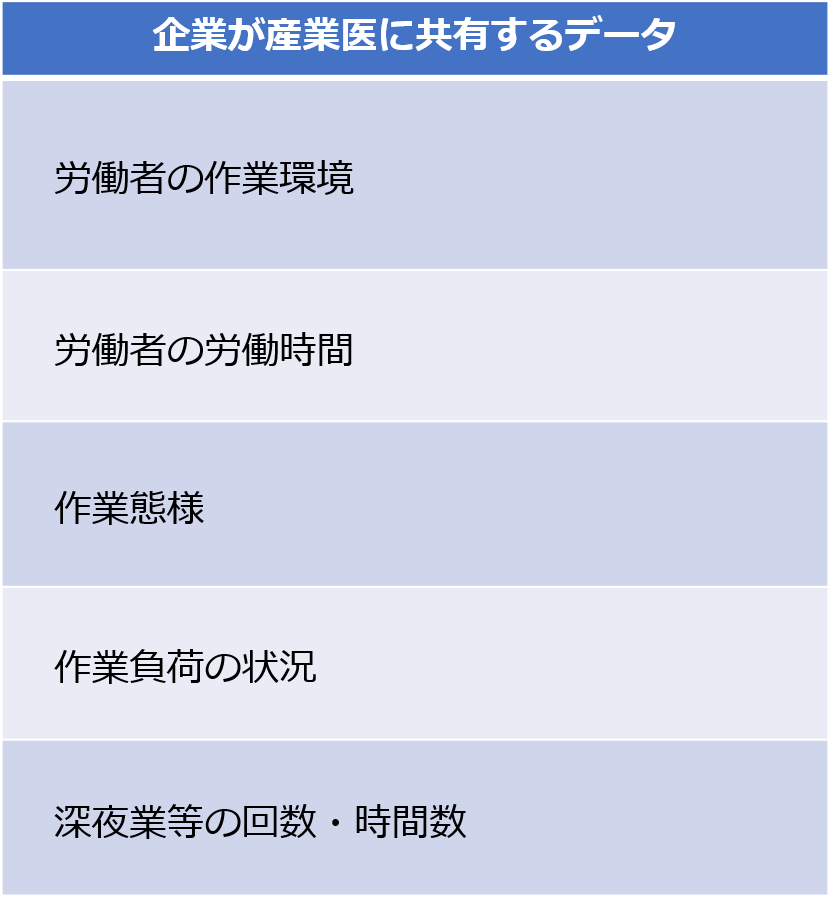 それに加え、「労働者の業務に関する情報であって産業医が労働者の健康管理等を適切に行うため必要と認めるもの」という項目があるのですが、以下が必要だとされています。