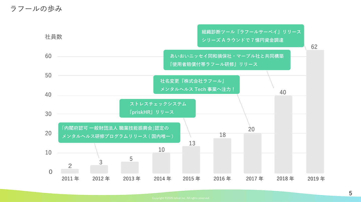 宮内(智):弊社は『ラフールサーベイ』というプロダクト事業を展開しているメンタルヘルステックの会社になります。『ラフールサーベイ』は「心理的安全性」と「エンゲージメント」を可視化する組織診断ツール、分かりやすく簡単に言うと「組織の健康診断ができるツール」です。