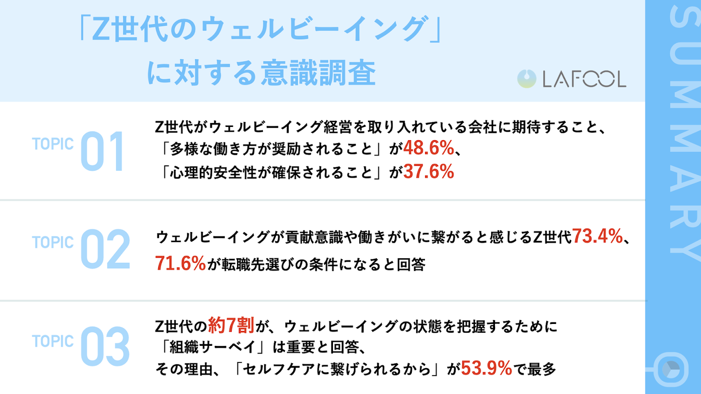 今回の調査では、Z世代は企業のウェルビーイングへの取り組みに期待が高いことが分かりました。ウェルビーイングが貢献意識や働きがいに繋がると回答したZ世代は7割に上り、転職先選びにおいてもウェルビーイングが重視されていることからも、ウェルビーイングへの取り組みは若手人材に強く求められている実態が明らかになりました。