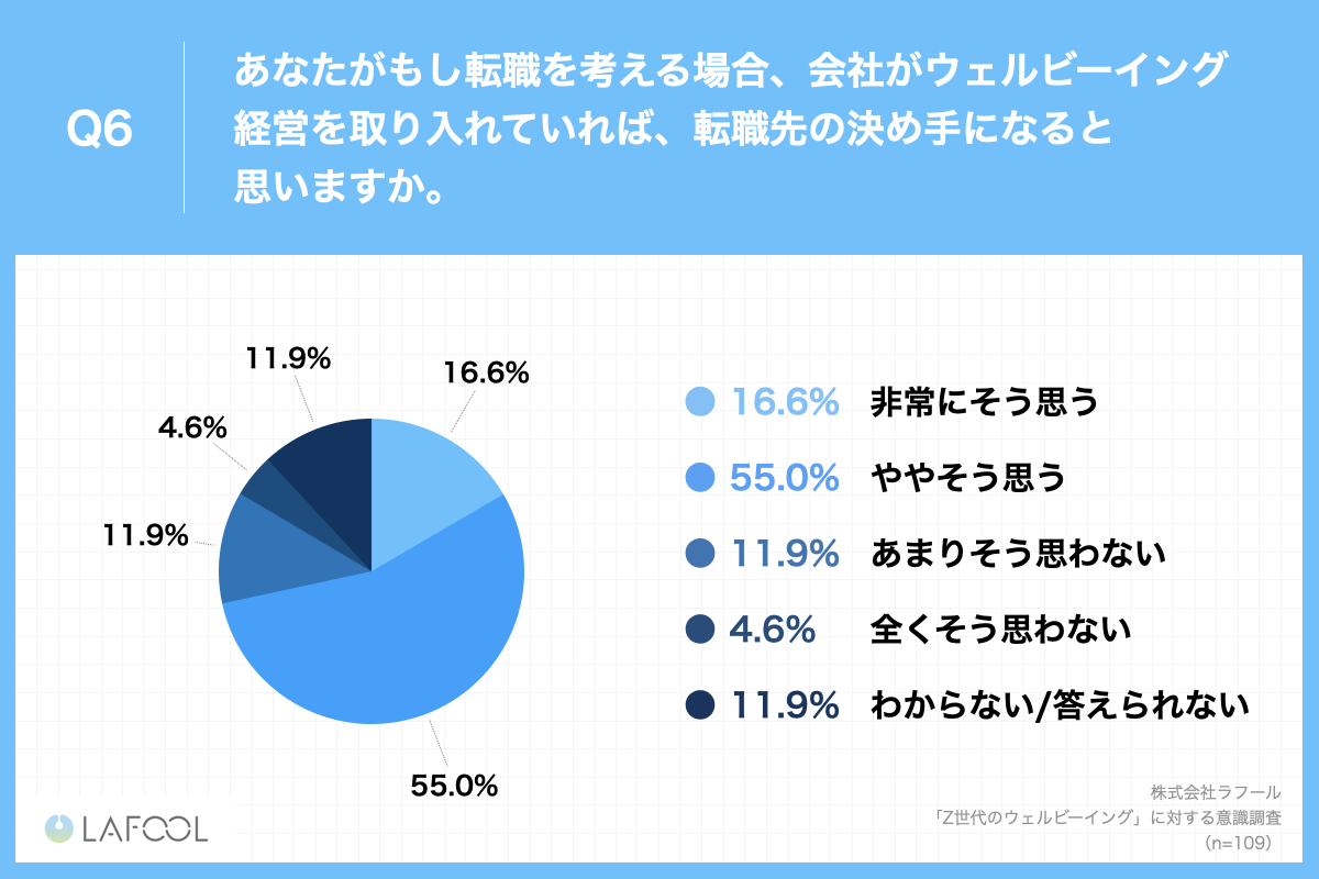 「Q6.あなたがもし転職を考える場合、会社がウェルビーイング経営を取り入れていれば、転職先の決め手になると思いますか。」(n=109)と質問したところ、「非常にそう思う」が16.6%、「ややそう思う」が55.0%という回答となりました。