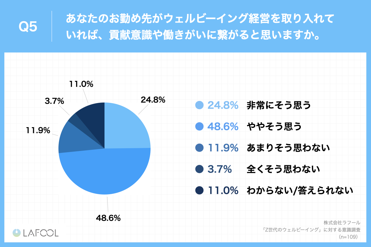 「Q5.あなたのお勤め先がウェルビーイング経営を取り入れていれば、貢献意識や働きがいに繋がると思いますか。」(n=109)と質問したところ、「非常にそう思う」が24.8%、「ややそう思う」が48.6%という回答となりました。